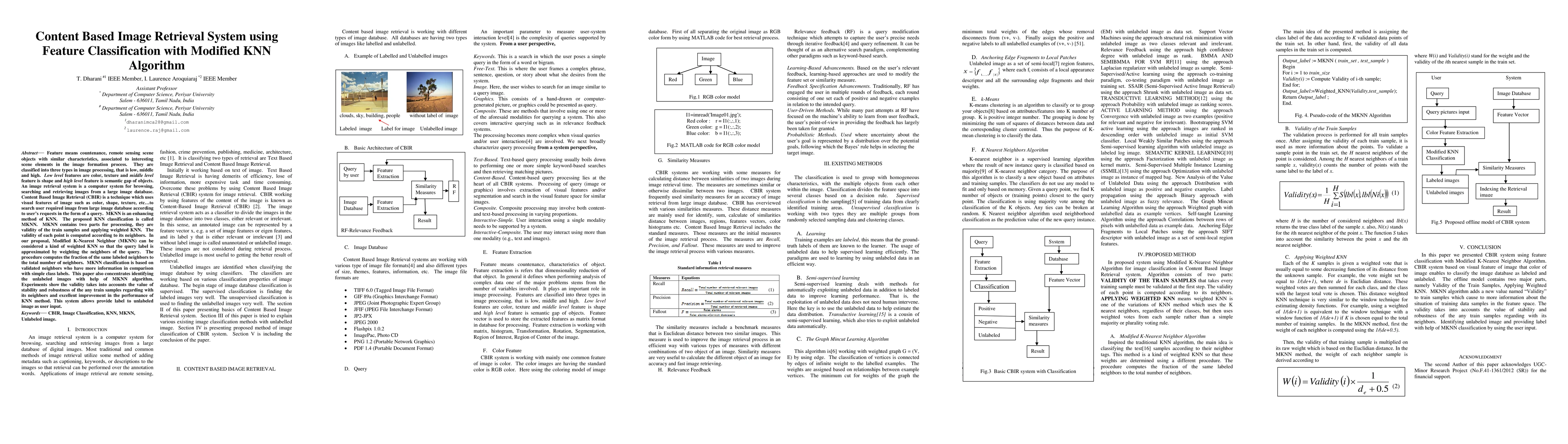 Feature means countenance, remote sensing scene objects with similar characteristics, associated to interesting scene elements in the image formation process. They are classified into three types in image processing, that is low, middle and high. Low level features are color, texture and middle level feature is shape and high level feature is semantic gap of objects. An image retrieval system is a computer system for browsing, searching and retrieving images from a large image database. Content Based Image Retrieval is a technique which uses visual features of image such as color, shape, texture to search user required image from large image database according to user requests in the form of a query. MKNN is an enhancing method of KNN. The proposed KNN classification is called MKNN. MKNN contains two parts for processing, they are validity of the train samples and applying weighted KNN. The validity of each point is computed according to its neighbors. In our proposal, Modified K-Nearest Neighbor can be considered a kind of weighted KNN so that the query label is approximated by weighting the neighbors of the query.