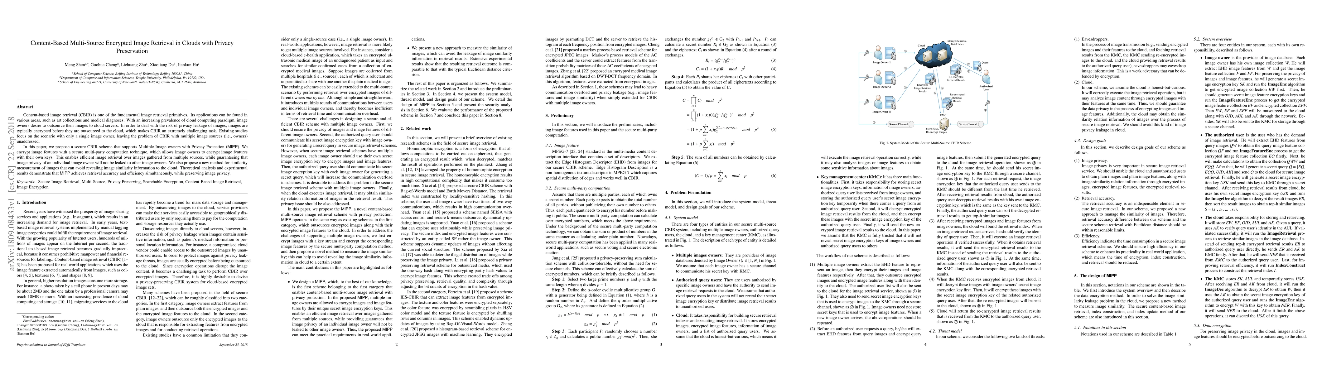 This paper proposes a secure content-based image retrieval (CBIR) scheme for multiple image owners in cloud environments, leveraging multi-party computation for encryption and a novel similarity measurement method to protect privacy. The proposed MIPP scheme ensures efficient retrieval and privacy preservation without revealing image similarity information to the cloud.