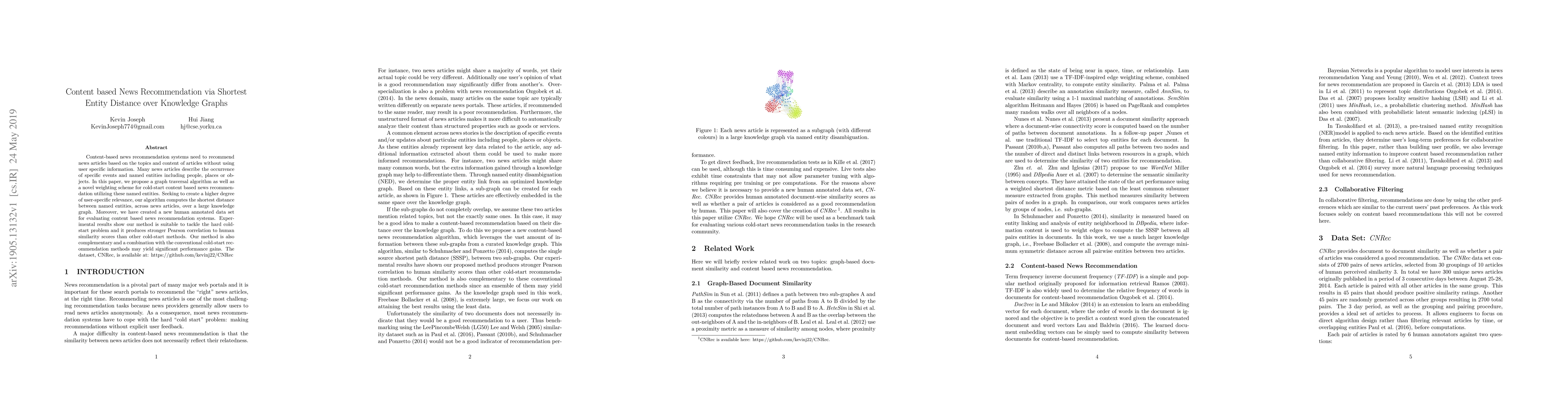 Content-based news recommendation systems need to recommend news articles based on the topics and content of articles without using user specific information. Many news articles describe the occurrence of specific events and named entities including people, places or objects. In this paper, we propose a graph traversal algorithm as well as a novel weighting scheme for cold-start content based news recommendation utilizing these named entities. Seeking to create a higher degree of user-specific relevance, our algorithm computes the shortest distance between named entities, across news articles, over a large knowledge graph. Moreover, we have created a new human annotated data set for evaluating content based news recommendation systems. Experimental results show our method is suitable to tackle the hard cold-start problem and it produces stronger Pearson correlation to human similarity scores than other cold-start methods. Our method is also complementary and a combination with the conventional cold-start recommendation methods may yield significant performance gains. The dataset, CNRec, is available at: https://github.com/kevinj22/CNRec