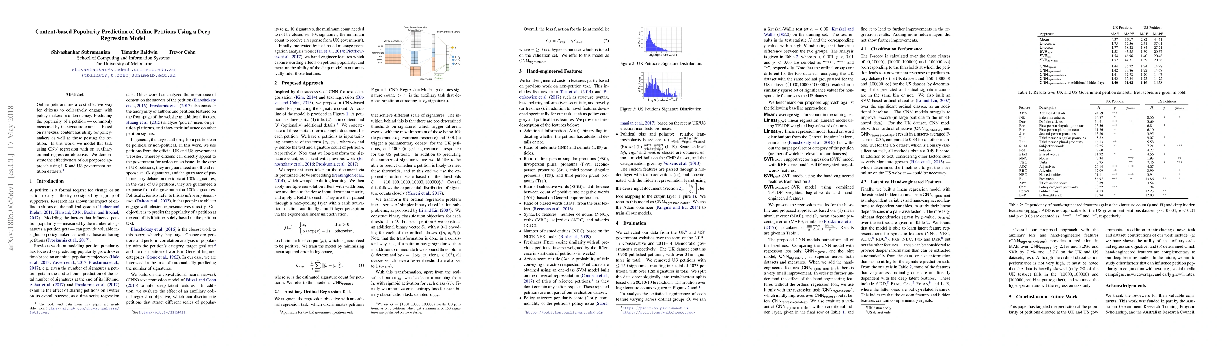 This paper proposes a CNN regression model with an auxiliary ordinal regression objective to predict the popularity of online petitions based on their textual content. The effectiveness of the approach is demonstrated using UK and US government petition datasets.