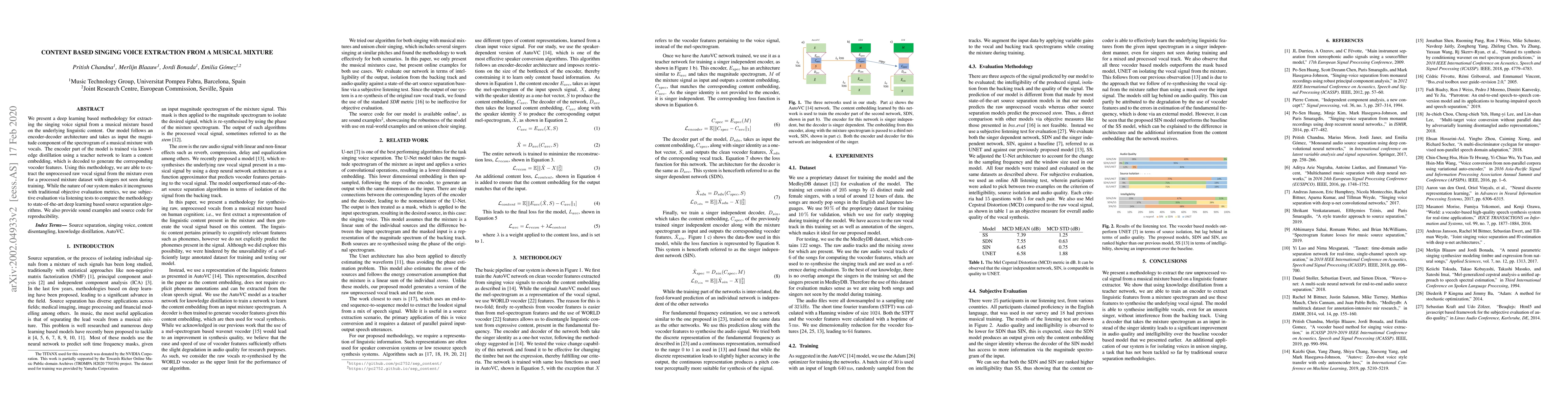 We present a deep learning based methodology for extracting the singing voice signal from a musical mixture based on the underlying linguistic content. Our model follows an encoder decoder architecture and takes as input the magnitude component of the spectrogram of a musical mixture with vocals. The encoder part of the model is trained via knowledge distillation using a teacher network to learn a content embedding, which is decoded to generate the corresponding vocoder features. Using this methodology, we are able to extract the unprocessed raw vocal signal from the mixture even for a processed mixture dataset with singers not seen during training. While the nature of our system makes it incongruous with traditional objective evaluation metrics, we use subjective evaluation via listening tests to compare the methodology to state-of-the-art deep learning based source separation algorithms. We also provide sound examples and source code for reproducibility.