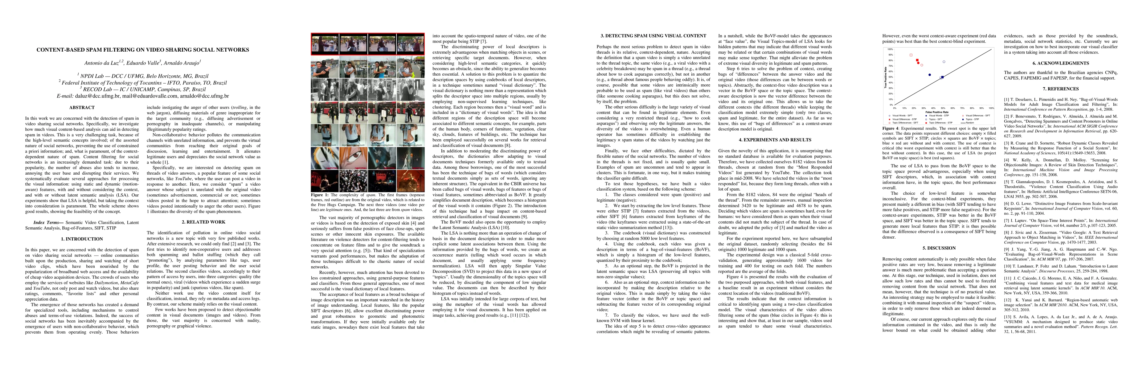 The development of a context-aware visual feature representation for spam video detection using bag-of-visual-words models and latent semantic analysis.