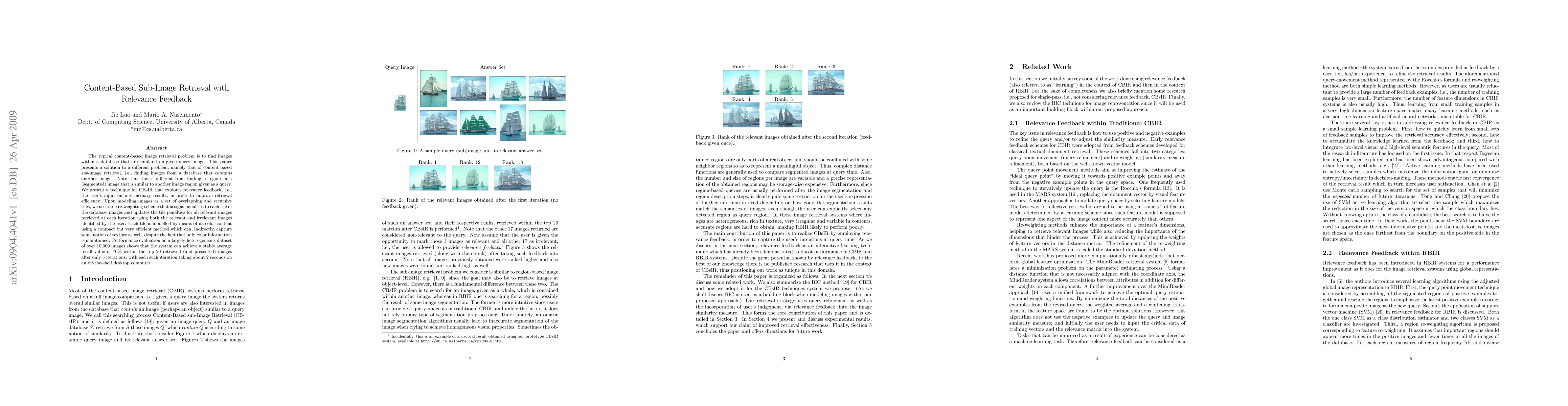 This paper proposes a content-based sub-image retrieval technique using relevance feedback to improve retrieval efficiency. It models images as overlapping tiles and employs a tile re-weighting scheme that updates penalties based on user feedback, achieving a stable average recall of 70% within the top 20 results after five iterations.