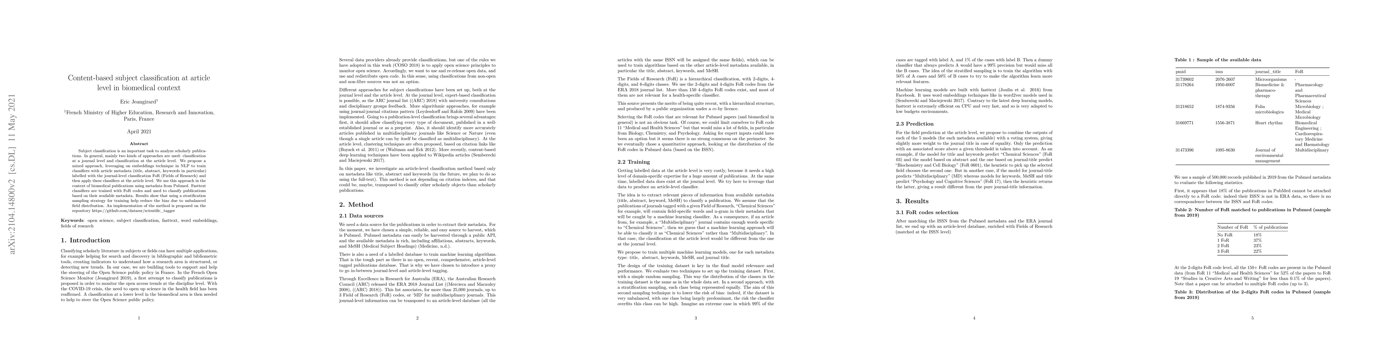 The research proposes a mixed approach for content-based subject classification at the article level in biomedical context, utilizing embeddings technique in NLP and FastText classifiers trained with article metadata (title, abstract, keywords) labelled with journal-level FoR (Fields of Research) codes, then applied at the article level using PubMed metadata.