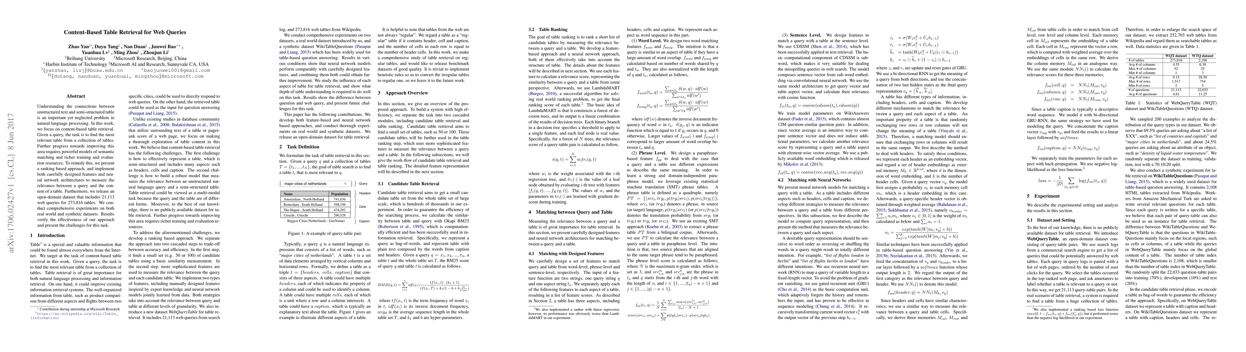 This paper proposes a content-based table retrieval method to match web queries with relevant tables, employing ranking-based approaches, designed features, and neural networks. It also releases a large dataset and demonstrates the effectiveness of the approach through comprehensive experiments.