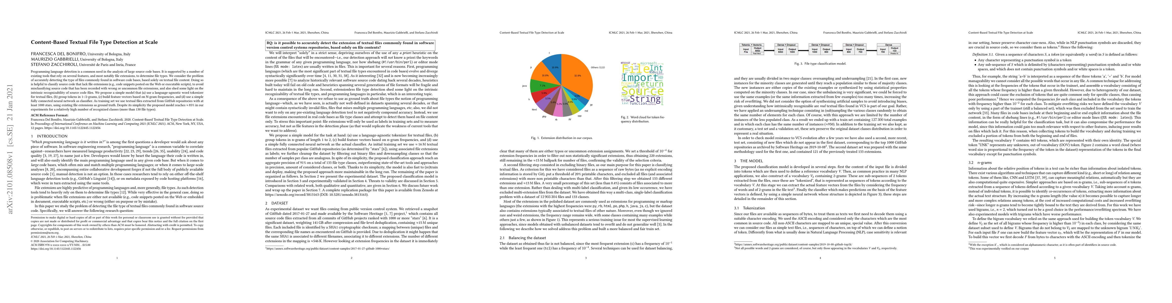 Programming language detection is a common need in the analysis of large source code bases. It is supported by a number of existing tools that rely on several features, and most notably file extensions, to determine file types. We consider the problem of accurately detecting the type of files commonly found in software code bases, based solely on textual file content. Doing so is helpful to classify source code that lack file extensions (e.g., code snippets posted on the Web or executable scripts), to avoid misclassifying source code that has been recorded with wrong or uncommon file extensions, and also shed some light on the intrinsic recognizability of source code files. We propose a simple model that (a) use a language-agnostic word tokenizer for textual files, (b) group tokens in 1-/2-grams, (c) build feature vectors based on N-gram frequencies, and (d) use a simple fully connected neural network as classifier. As training set we use textual files extracted from GitHub repositories with at least 1000 stars, using existing file extensions as ground truth. Despite its simplicity the proposed model reaches 85% in our experiments for a relatively high number of recognized classes (more than 130 file types).