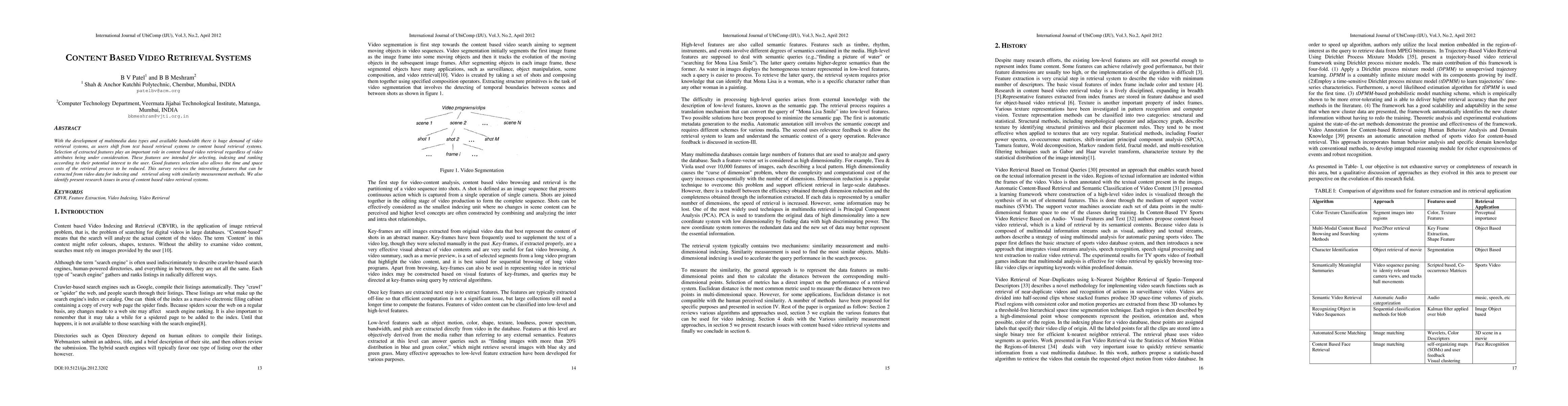 With the development of multimedia data types and available bandwidth there is huge demand of video retrieval systems, as users shift from text based retrieval systems to content based retrieval systems. Selection of extracted features play an important role in content based video retrieval regardless of video attributes being under consideration. These features are intended for selecting, indexing and ranking according to their potential interest to the user. Good features selection also allows the time and space costs of the retrieval process to be reduced. This survey reviews the interesting features that can be extracted from video data for indexing and retrieval along with similarity measurement methods. We also identify present research issues in area of content based video retrieval systems.