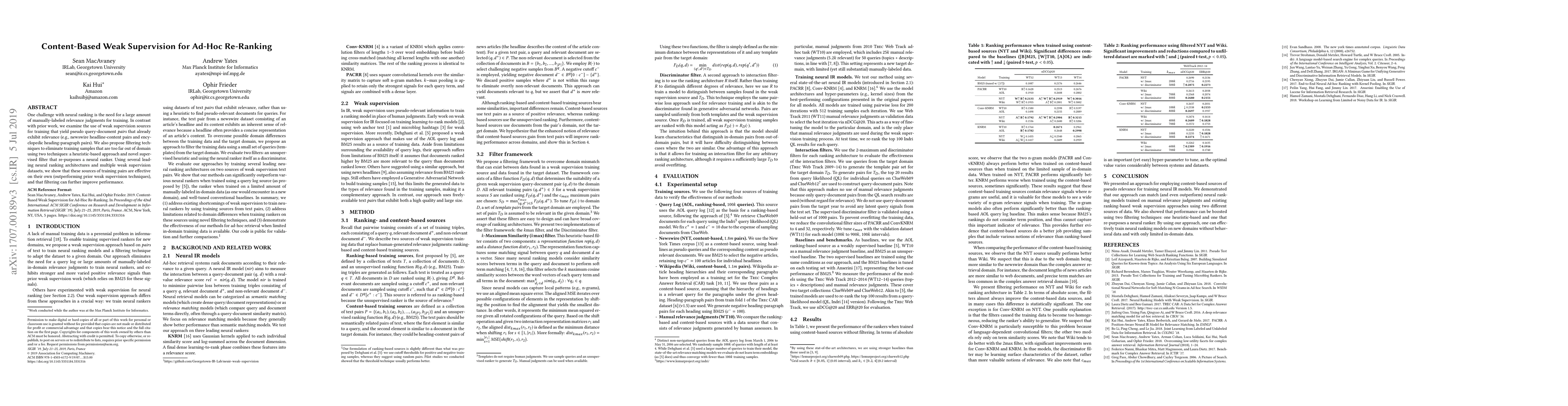 This paper explores using weak supervision sources for training neural ranking models, proposing methods to generate pseudo relevance pairs and techniques to filter out out-of-domain samples. Experiments show that these weak supervision sources can effectively improve neural ranking performance.