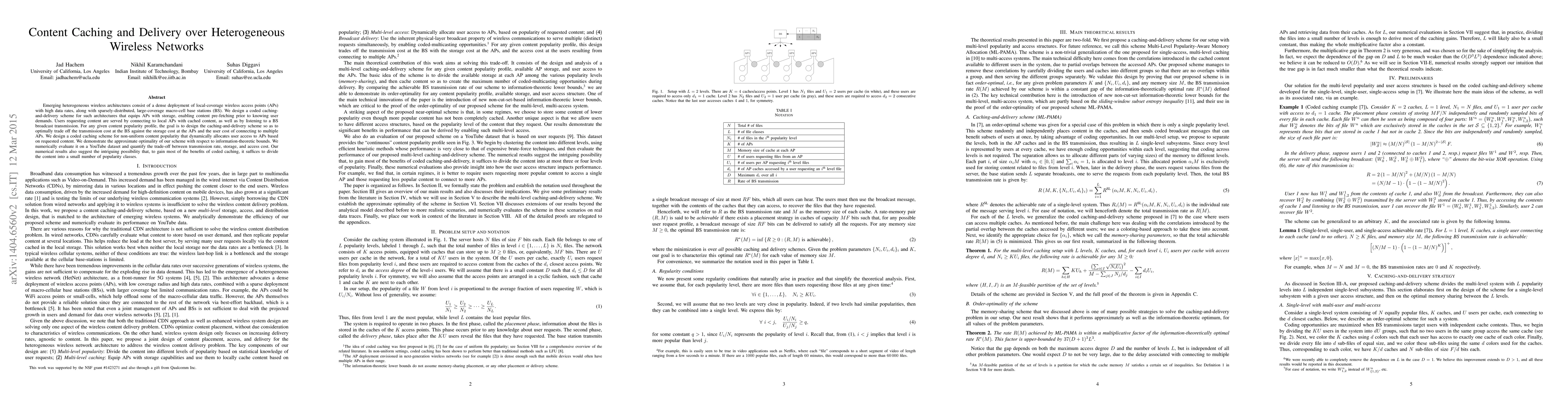 Emerging heterogeneous wireless architectures consist of a dense deployment of local-coverage wireless access points (APs) with high data rates, along with sparsely-distributed, large-coverage macro-cell base stations (BS). We design a coded caching-and-delivery scheme for such architectures that equips APs with storage, enabling content pre-fetching prior to knowing user demands. Users requesting content are served by connecting to local APs with cached content, as well as by listening to a BS broadcast transmission. For any given content popularity profile, the goal is to design the caching-and-delivery scheme so as to optimally trade off the transmission cost at the BS against the storage cost at the APs and the user cost of connecting to multiple APs. We design a coded caching scheme for non-uniform content popularity that dynamically allocates user access to APs based on requested content. We demonstrate the approximate optimality of our scheme with respect to information-theoretic bounds. We numerically evaluate it on a YouTube dataset and quantify the trade-off between transmission rate, storage, and access cost. Our numerical results also suggest the intriguing possibility that, to gain most of the benefits of coded caching, it suffices to divide the content into a small number of popularity classes.