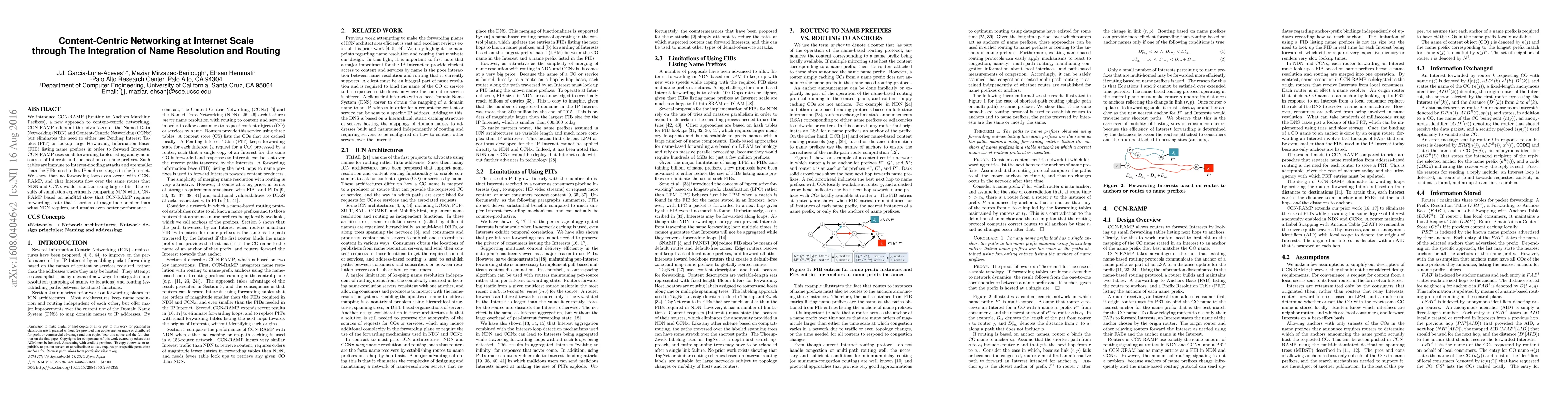 CCN-RAMP introduces a novel content-centric networking approach that integrates name resolution and routing, minimizing forwarding state and eliminating the need for large lookup tables, while maintaining performance comparable to Named Data Networking (NDN) and Content-Centric Networking (CCNx). Simulation results show CCN-RAMP achieves significantly smaller forwarding tables and better performance than NDN.