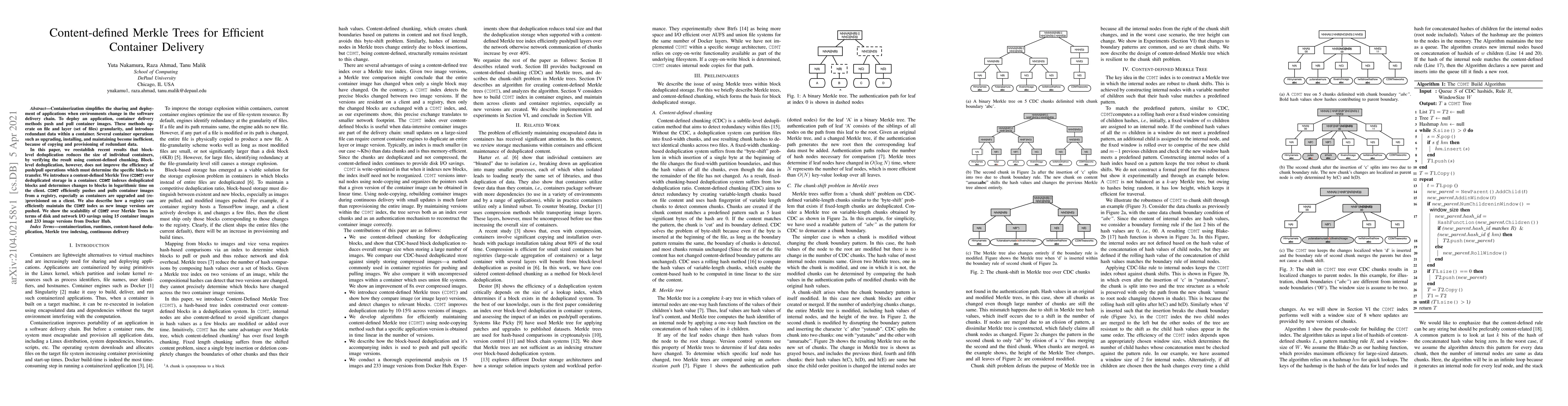 This paper proposes a content-defined Merkle Tree (\CDMT{}) to enhance container delivery efficiency by indexing deduplicated blocks, enabling efficient push/pull operations and reducing redundant data transfer during upgrades and provisioning. The \CDMT{} method demonstrates significant disk and network I/O savings in scalability tests using Docker Hub data.