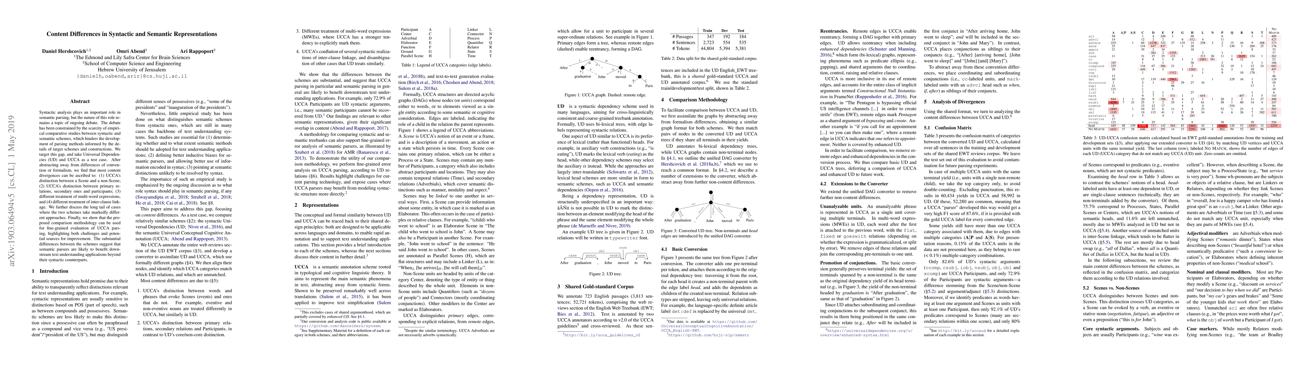 The paper uses Universal Dependencies (UD) and UCCA as a test case for comparing syntactic and semantic schemes, abstracting away from differences in convention or formalism.