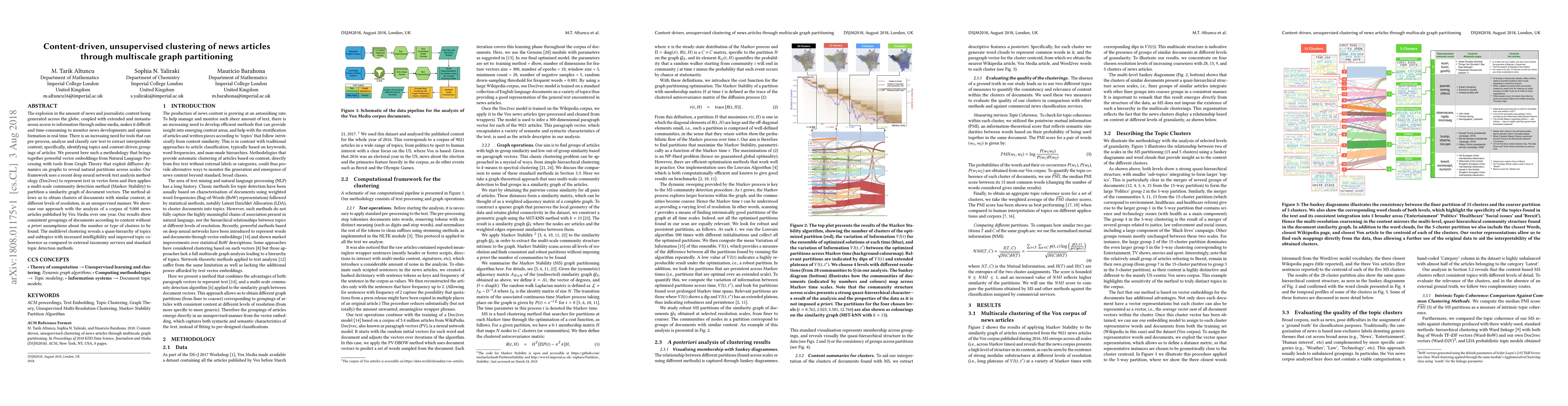 This paper presents an unsupervised clustering method combining Doc2vec embeddings and multiscale graph partitioning to classify news articles by content. The approach reveals natural document groupings across different resolutions, demonstrating improved topic coherence compared to existing methods.