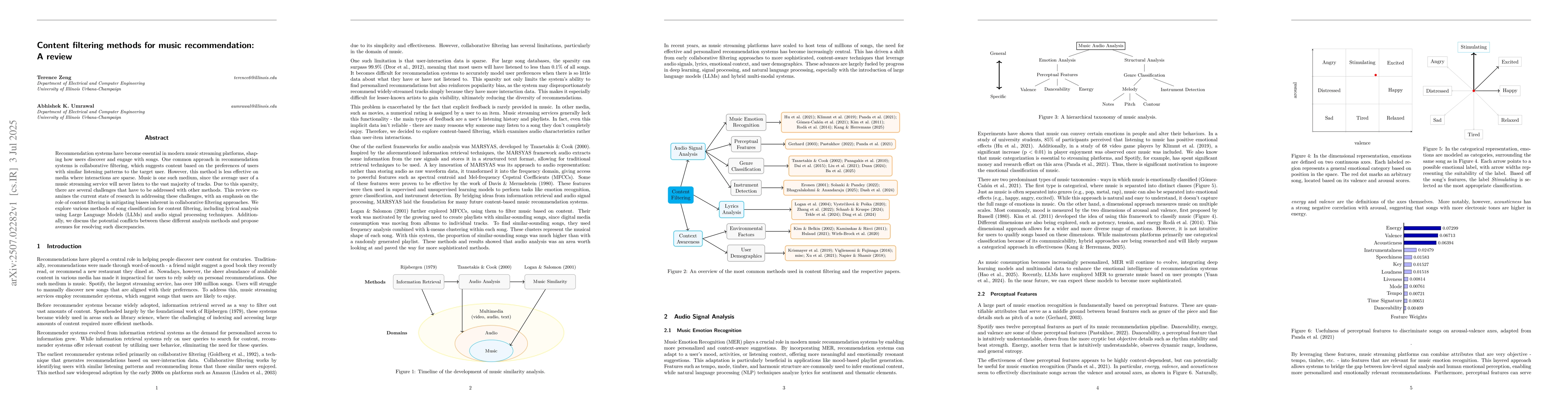 Recommendation systems have become essential in modern music streaming platforms, shaping how users discover and engage with songs. One common approach in recommendation systems is collaborative filtering, which suggests content based on the preferences of users with similar listening patterns to the target user. However, this method is less effective on media where interactions are sparse. Music is one such medium, since the average user of a music streaming service will never listen to the vast majority of tracks. Due to this sparsity, there are several challenges that have to be addressed with other methods. This review examines the current state of research in addressing these challenges, with an emphasis on the role of content filtering in mitigating biases inherent in collaborative filtering approaches. We explore various methods of song classification for content filtering, including lyrical analysis using Large Language Models (LLMs) and audio signal processing techniques. Additionally, we discuss the potential conflicts between these different analysis methods and propose avenues for resolving such discrepancies.