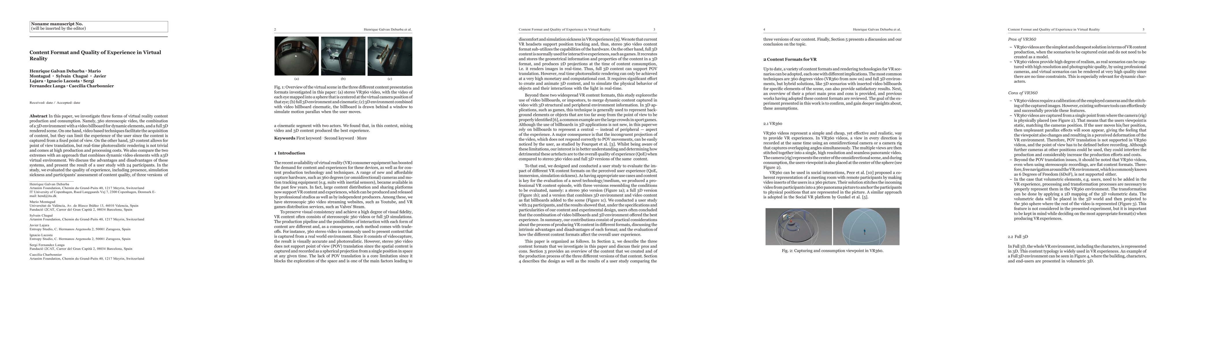 This paper examines three virtual reality content formats—360 stereoscopic video, hybrid 3D environments with video billboards, and full 3D rendering—and evaluates their quality of experience through a user study. The study found that combining dynamic video elements with a 3D environment yielded the best overall experience in terms of presence and content quality.