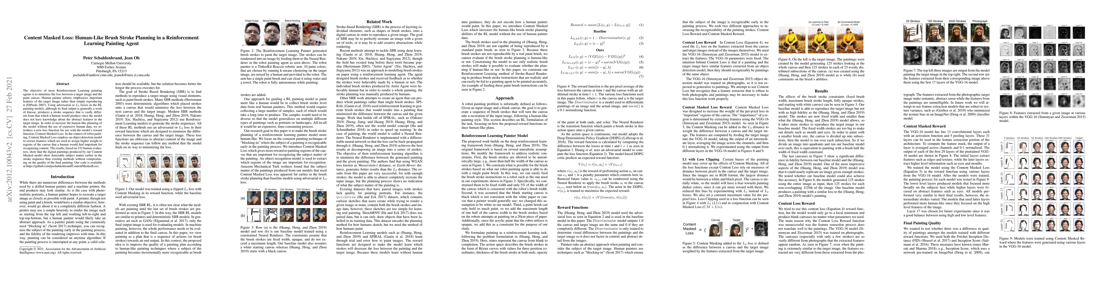 This paper introduces Content Masked Loss to improve reinforcement learning painting agents by emphasizing important features in the target image, mimicking human brush stroke planning. The new loss function, combined with an object detection model, assigns higher weights to significant regions, resulting in paintings that reveal subject matter earlier and maintain high quality.