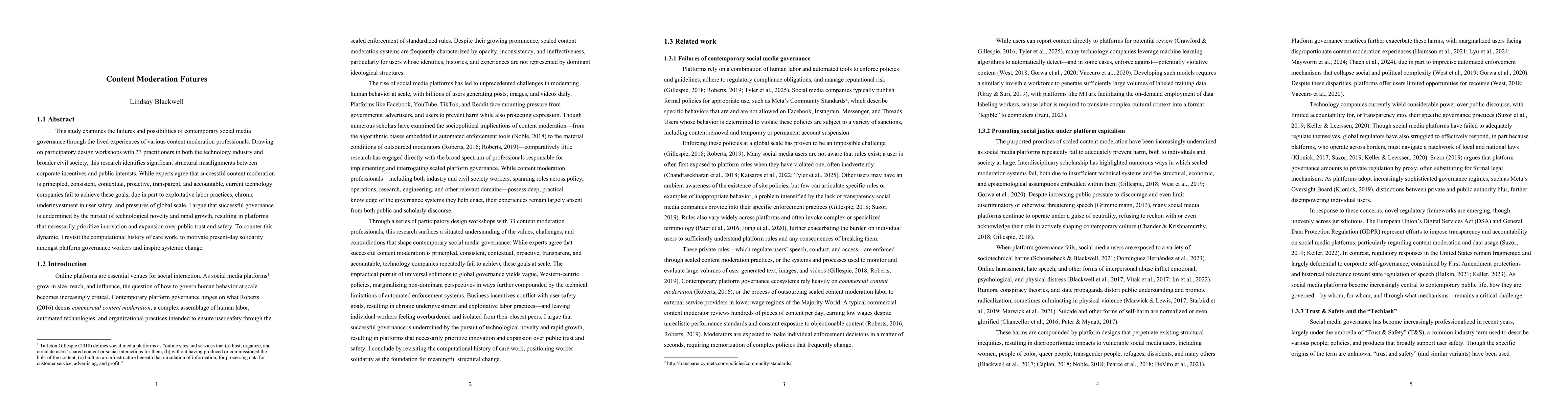 This study examines the failures and possibilities of contemporary social media governance through the lived experiences of various content moderation professionals. Drawing on participatory design workshops with 33 practitioners in both the technology industry and broader civil society, this research identifies significant structural misalignments between corporate incentives and public interests. While experts agree that successful content moderation is principled, consistent, contextual, proactive, transparent, and accountable, current technology companies fail to achieve these goals, due in part to exploitative labor practices, chronic underinvestment in user safety, and pressures of global scale. I argue that successful governance is undermined by the pursuit of technological novelty and rapid growth, resulting in platforms that necessarily prioritize innovation and expansion over public trust and safety. To counter this dynamic, I revisit the computational history of care work, to motivate present-day solidarity amongst platform governance workers and inspire systemic change.