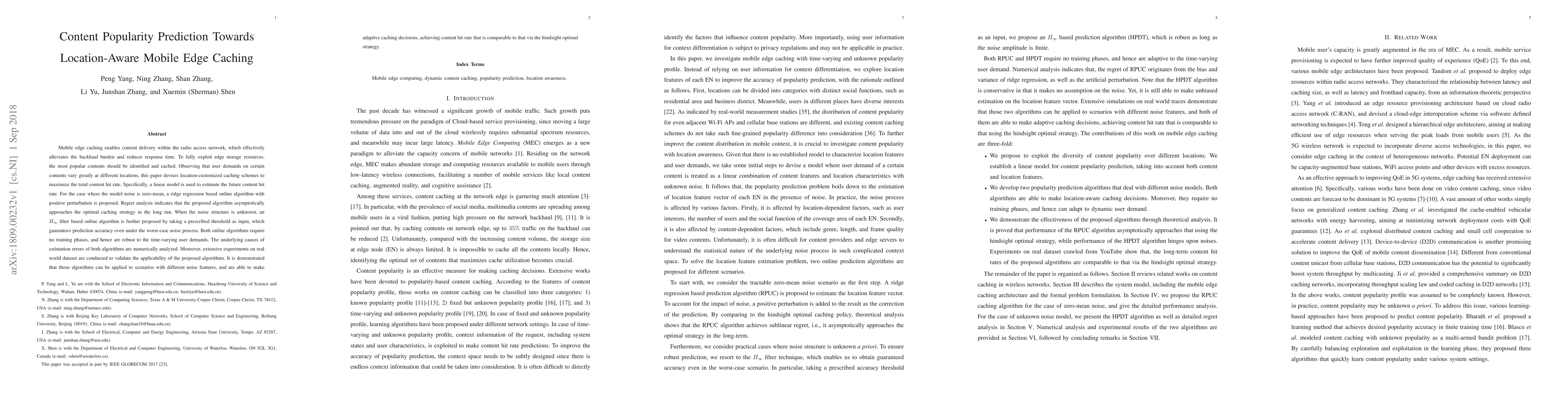 Mobile edge caching enables content delivery within the radio access network, which effectively alleviates the backhaul burden and reduces response time. To fully exploit edge storage resources, the most popular contents should be identified and cached. Observing that user demands on certain contents vary greatly at different locations, this paper devises location-customized caching schemes to maximize the total content hit rate. Specifically, a linear model is used to estimate the future content hit rate. For the case where the model noise is zero-mean, a ridge regression based online algorithm with positive perturbation is proposed. Regret analysis indicates that the proposed algorithm asymptotically approaches the optimal caching strategy in the long run. When the noise structure is unknown, an $H_{\infty}$ filter based online algorithm is further proposed by taking a prescribed threshold as input, which guarantees prediction accuracy even under the worst-case noise process. Both online algorithms require no training phases, and hence are robust to the time-varying user demands. The underlying causes of estimation errors of both algorithms are numerically analyzed. Moreover, extensive experiments on real world dataset are conducted to validate the applicability of the proposed algorithms. It is demonstrated that those algorithms can be applied to scenarios with different noise features, and are able to make adaptive caching decisions, achieving content hit rate that is comparable to that via the hindsight optimal strategy.