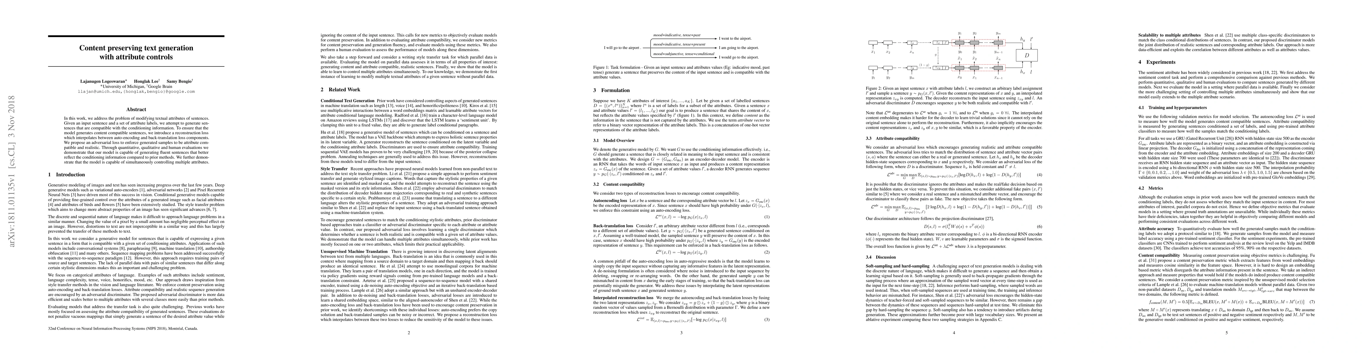 In this work, we address the problem of modifying textual attributes of sentences. Given an input sentence and a set of attribute labels, we attempt to generate sentences that are compatible with the conditioning information. To ensure that the model generates content compatible sentences, we introduce a reconstruction loss which interpolates between auto-encoding and back-translation loss components. We propose an adversarial loss to enforce generated samples to be attribute compatible and realistic. Through quantitative, qualitative and human evaluations we demonstrate that our model is capable of generating fluent sentences that better reflect the conditioning information compared to prior methods. We further demonstrate that the model is capable of simultaneously controlling multiple attributes.