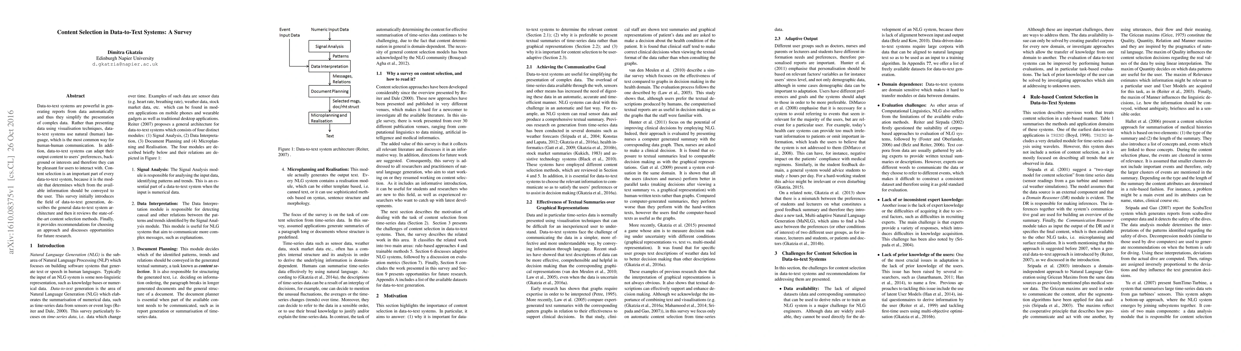 This survey explores the field of data-to-text systems, emphasizing the importance of content selection in determining the information conveyed to users. It reviews current methods and offers recommendations for future research directions.