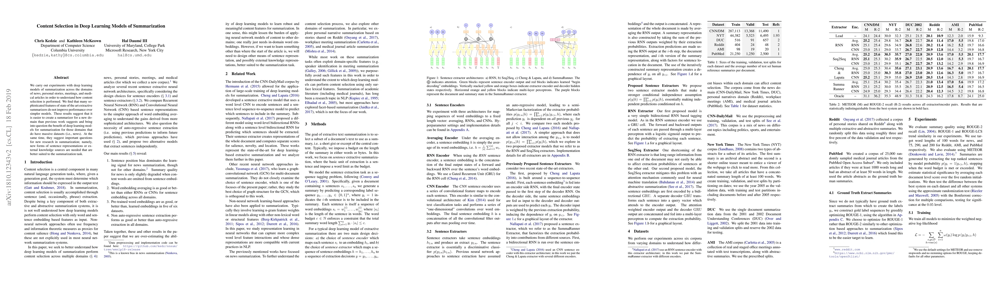 This research explores deep learning models for summarization across various domains, finding that advanced features do not significantly enhance performance over simpler models. The study suggests that creating summarizers for new domains may be easier than previously thought, while also indicating a need for new sentence representations or knowledge sources to improve summarization.