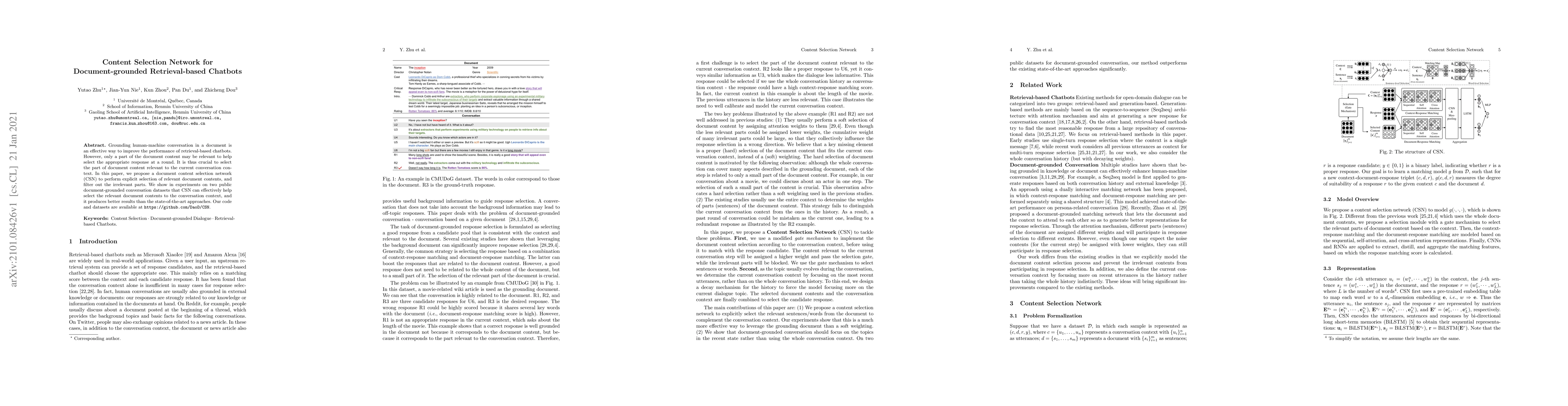 A new approach called Content Selection Network (CSN) improves document-grounded chatbots by selecting relevant document content for conversation context, outperforming state-of-the-art methods in experiments.