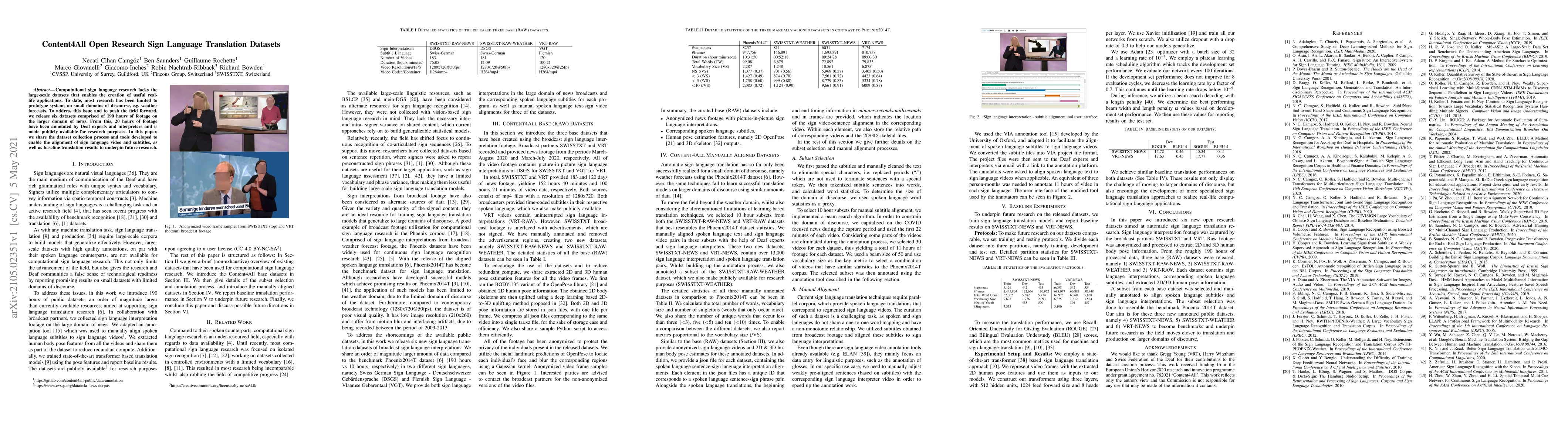 The paper details the creation and release of six sign language translation datasets, including 20 hours of manually annotated footage in Swiss German Sign Language (DSGS) and Flemish Sign Language (VGT), aligned with spoken language subtitles. The datasets also include 2D and 3D human pose estimations.