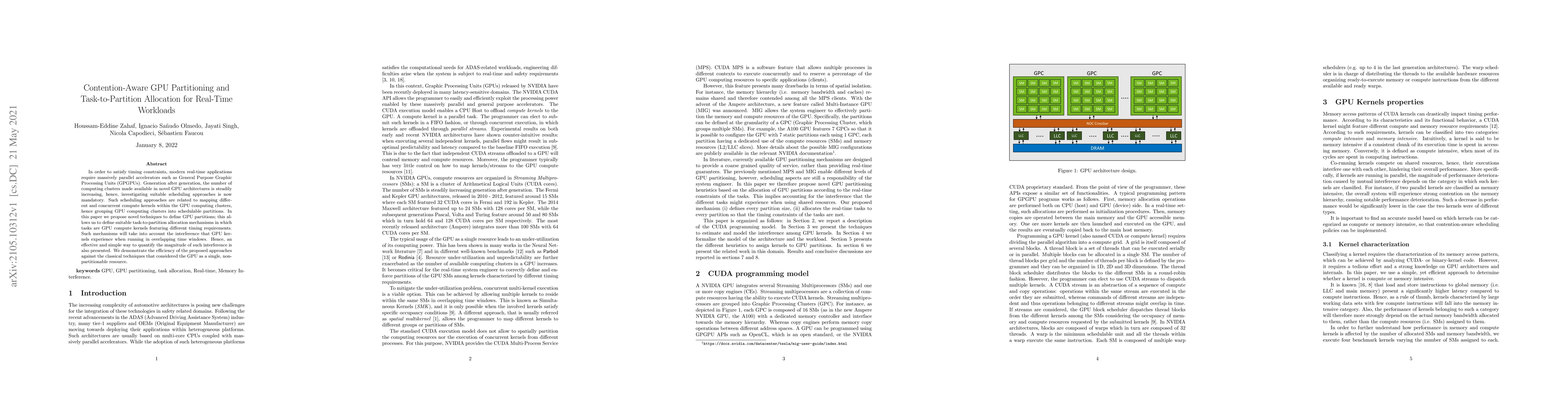 In order to satisfy timing constraints, modern real-time applications require massively parallel accelerators such as General Purpose Graphic Processing Units (GPGPUs). Generation after generation, the number of computing clusters made available in novel GPU architectures is steadily increasing, hence, investigating suitable scheduling approaches is now mandatory. Such scheduling approaches are related to mapping different and concurrent compute kernels within the GPU computing clusters, hence grouping GPU computing clusters into schedulable partitions. In this paper we propose novel techniques to define GPU partitions; this allows us to define suitable task-to-partition allocation mechanisms in which tasks are GPU compute kernels featuring different timing requirements. Such mechanisms will take into account the interference that GPU kernels experience when running in overlapping time windows. Hence, an effective and simple way to quantify the magnitude of such interference is also presented. We demonstrate the efficiency of the proposed approaches against the classical techniques that considered the GPU as a single, non-partitionable resource.