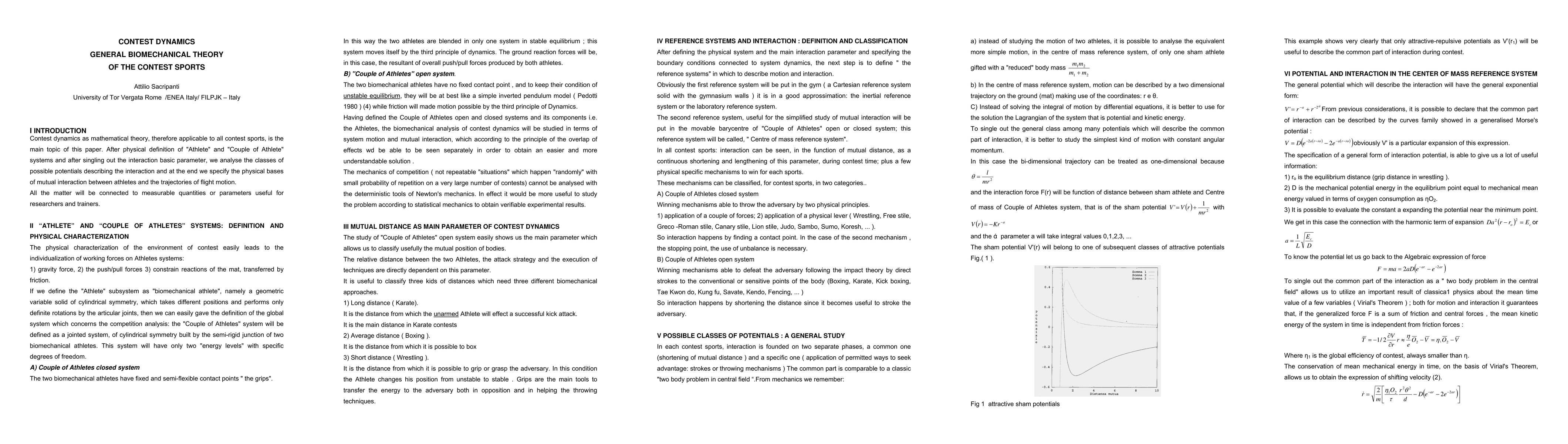 In this report it is approched the Contest dynamics as mathematical theory, therefore applicable to all contest sports. Starting with the physical definition of Athlete and Couple of Athlete systems and after singling out the interaction basic parameter, there are analyzed the classes of possible potentials describing the interaction. At the end there are specified the physical bases of mutual interaction between athletes and the trajectories of flight motion. All the matter will be connected to measurable quantities or parameters useful for researchers and trainers.