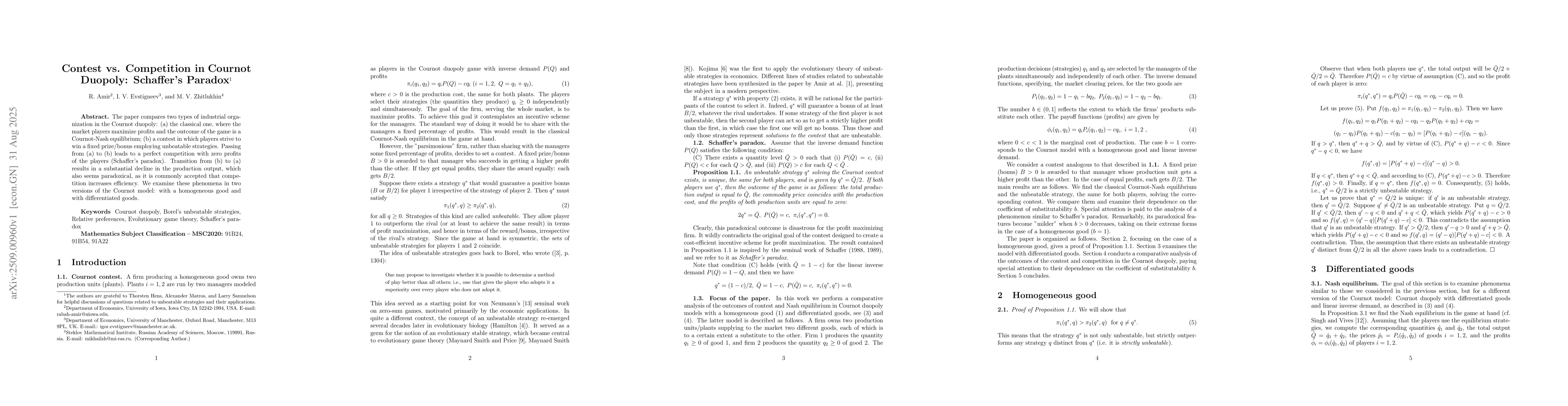 The paper compares two types of industrial organization in the Cournot duopoly: (a) the classical one, where the market players maximize profits and the outcome of the game is a Cournot-Nash equilibrium; (b) a contest in which players strive to win a fixed prize/bonus employing unbeatable strategies. Passing from (a) to (b) leads to a perfect competition with zero profits of the players (Schaffer's paradox). Transition from (b) to (a) results in a substantial decline in the production output, which also seems paradoxical, as it is commonly accepted that competition increases efficiency. We examine these phenomena in two versions of the Cournot model: with a homogeneous good and with differentiated goods.