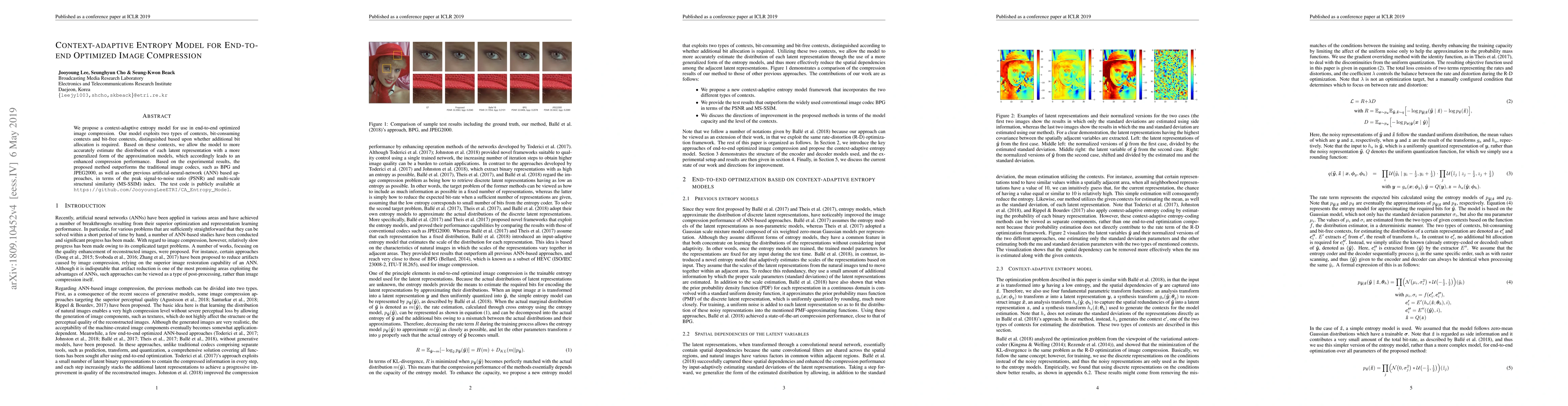 We propose a context-adaptive entropy model for use in end-to-end optimized image compression. Our model exploits two types of contexts, bit-consuming contexts and bit-free contexts, distinguished based upon whether additional bit allocation is required. Based on these contexts, we allow the model to more accurately estimate the distribution of each latent representation with a more generalized form of the approximation models, which accordingly leads to an enhanced compression performance. Based on the experimental results, the proposed method outperforms the traditional image codecs, such as BPG and JPEG2000, as well as other previous artificial-neural-network (ANN) based approaches, in terms of the peak signal-to-noise ratio (PSNR) and multi-scale structural similarity (MS-SSIM) index.