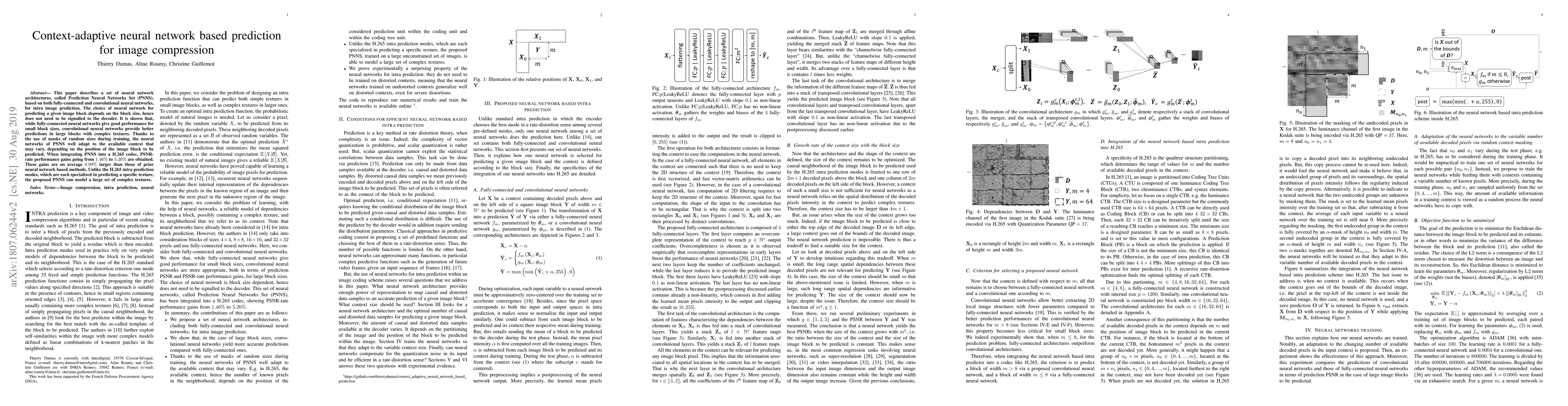 This paper proposes a context-adaptive neural network architecture called Prediction Neural Networks Set (PNNS) for intra image prediction, achieving better performance in H.265 codec by integrating fully-connected and convolutional neural networks based on image block size. The method shows PSNR-rate performance gains of 1.46% to 5.20%, outperforming prior methods.