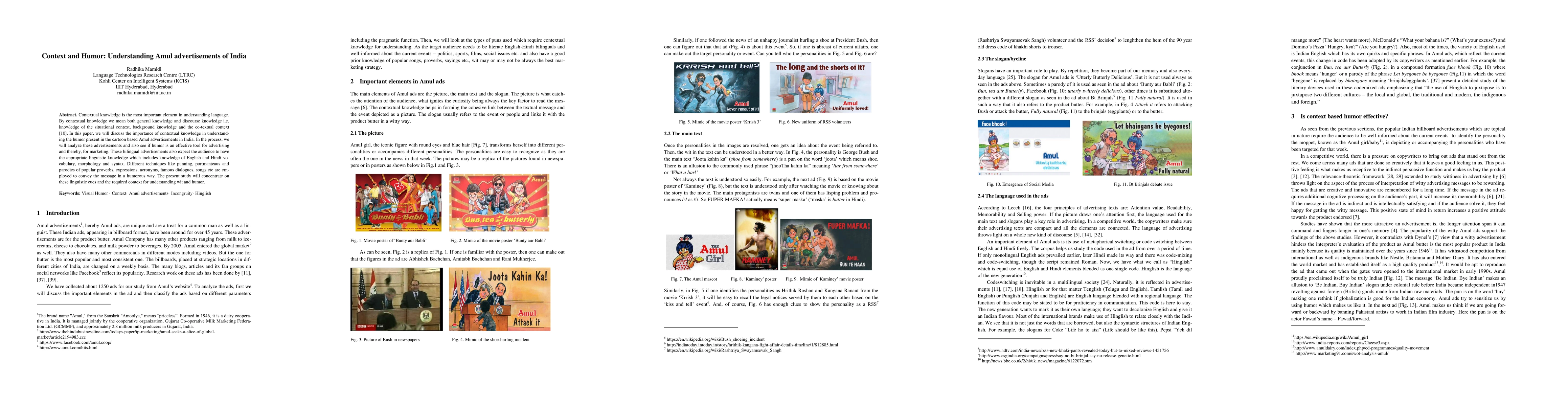 Contextual knowledge is the most important element in understanding language. By contextual knowledge we mean both general knowledge and discourse knowledge i.e. knowledge of the situational context, background knowledge and the co-textual context [10]. In this paper, we will discuss the importance of contextual knowledge in understanding the humor present in the cartoon based Amul advertisements in India.In the process, we will analyze these advertisements and also see if humor is an effective tool for advertising and thereby, for marketing.These bilingual advertisements also expect the audience to have the appropriate linguistic knowledge which includes knowledge of English and Hindi vocabulary, morphology and syntax. Different techniques like punning, portmanteaus and parodies of popular proverbs, expressions, acronyms, famous dialogues, songs etc are employed to convey the message in a humorous way. The present study will concentrate on these linguistic cues and the required context for understanding wit and humor.