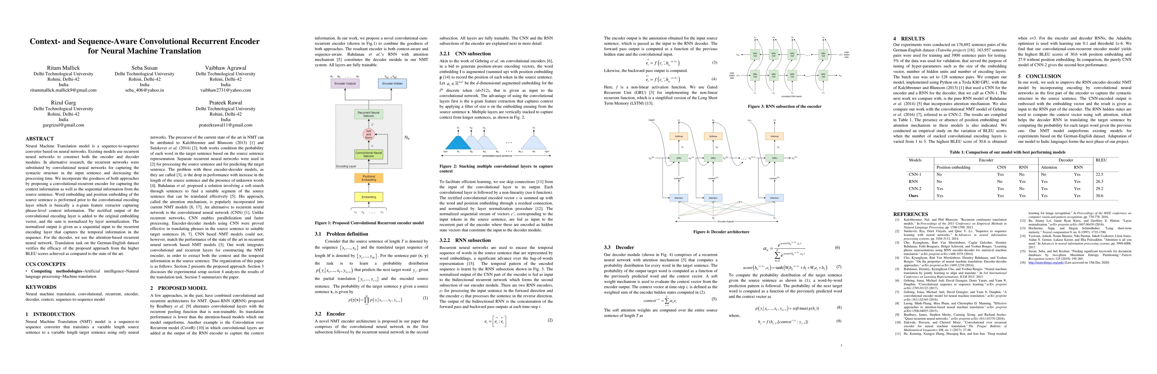 This paper proposes a hybrid convolutional-recurrent encoder for neural machine translation, combining convolutional networks for context awareness and recurrent networks for sequence information. The approach achieves higher BLEU scores on a German-English dataset, demonstrating improved translation performance.