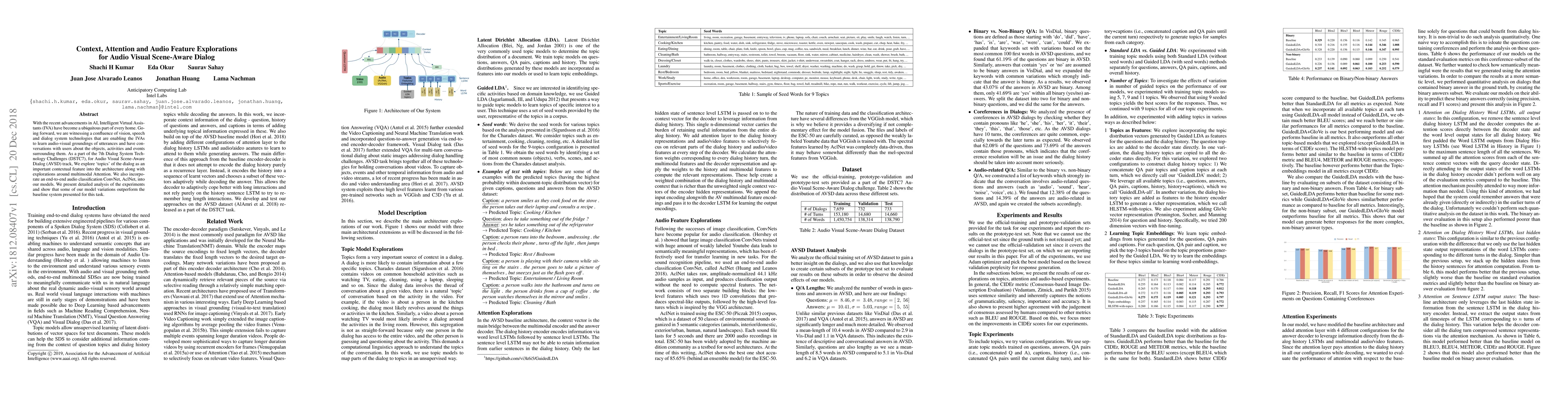 With the recent advancements in AI, Intelligent Virtual Assistants (IVA) have become a ubiquitous part of every home. Going forward, we are witnessing a confluence of vision, speech and dialog system technologies that are enabling the IVAs to learn audio-visual groundings of utterances and have conversations with users about the objects, activities and events surrounding them. As a part of the 7th Dialog System Technology Challenges (DSTC7), for Audio Visual Scene-Aware Dialog (AVSD) track, We explore `topics' of the dialog as an important contextual feature into the architecture along with explorations around multimodal Attention. We also incorporate an end-to-end audio classification ConvNet, AclNet, into our models. We present detailed analysis of the experiments and show that some of our model variations outperform the baseline system presented for this task.