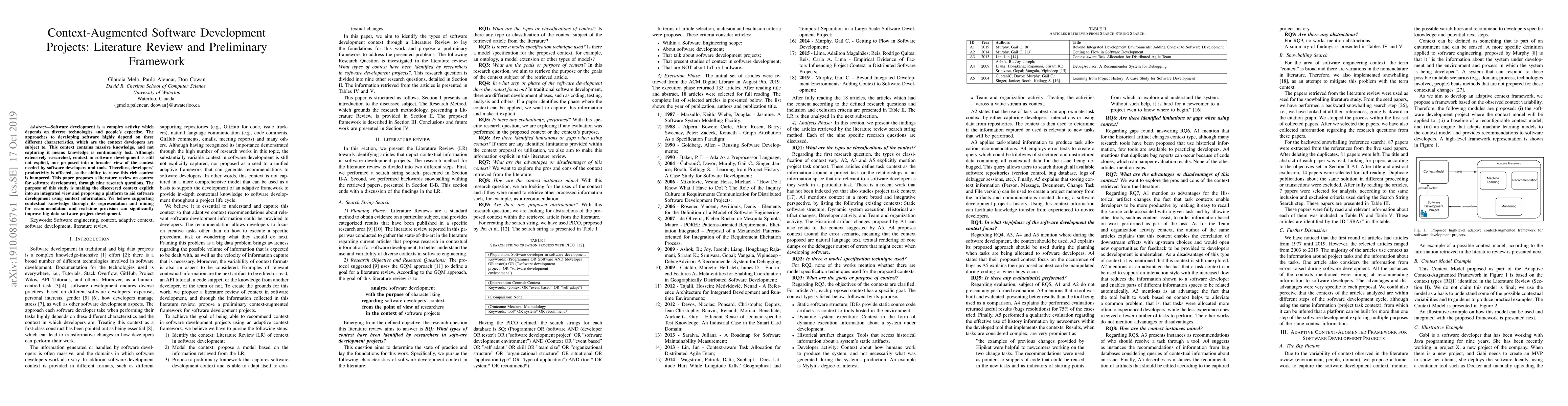 Software development is a complex activity which depends on diverse technologies and people's expertise. The approaches to developing software highly depend on these different characteristics, which are the context developers are subject to. This context contains massive knowledge, and not capturing it means knowledge is continuously lost. Although extensively researched, context in software development is still not explicit, nor proposed into a broader view of the context needed by software developers and tools. Therefore, developers' productivity is affected, as the ability to reuse this rich context is hampered. This paper proposes a literature review on context for software development, through nine research questions. The purpose of this study is making the discovered context explicit into an integrated view and proposing a platform to aid software development using context information. We believe supporting contextual knowledge through its representation and mining for recommendation and real-time provision can significantly improve big data software project development.