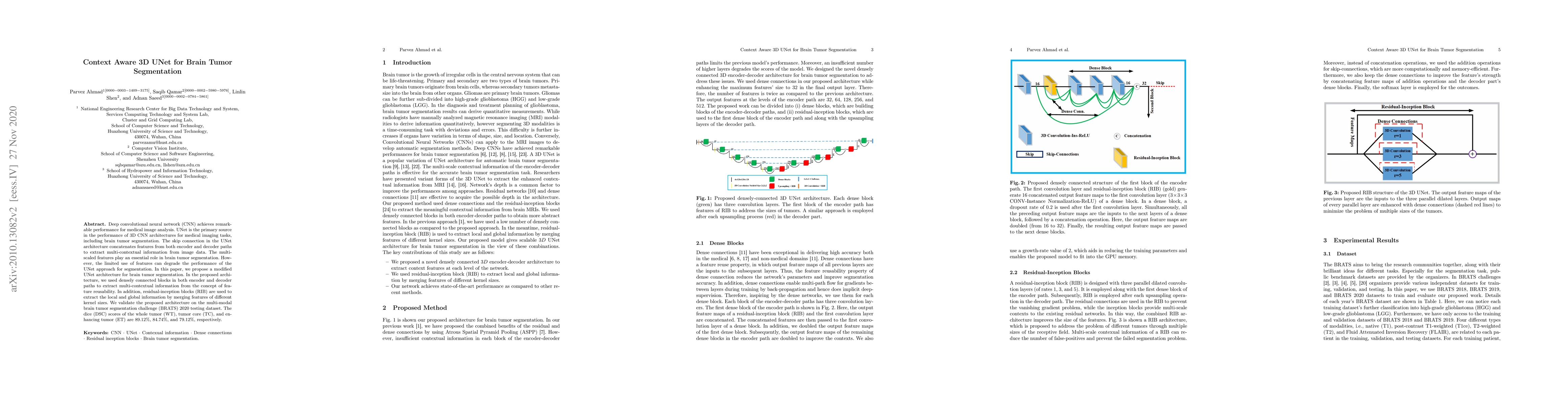 This paper proposes a modified 3D UNet architecture for brain tumor segmentation using densely connected blocks and residual-inception blocks to enhance feature extraction and context awareness. Experimental results on the BRATS 2020 dataset show high Dice scores for whole tumor, tumor core, and enhancing tumor segmentation.