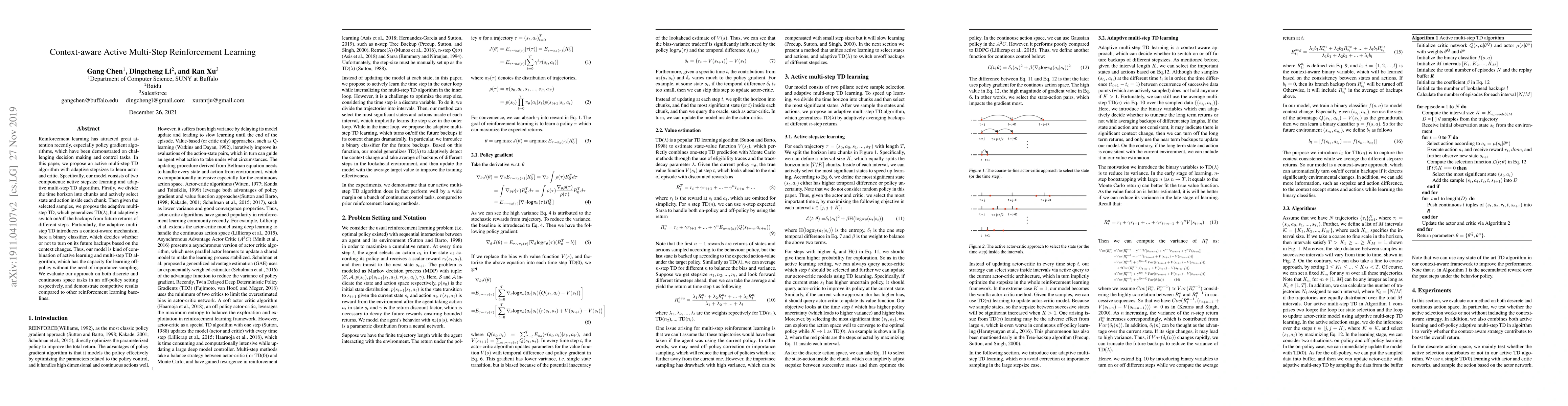 This paper proposes an active multi-step TD algorithm with adaptive stepsizes for reinforcement learning, combining active learning and adaptive multi-step TD to learn actor and critic functions. The model uses a context-aware mechanism to decide when to incorporate future returns, achieving competitive results in off-policy settings.