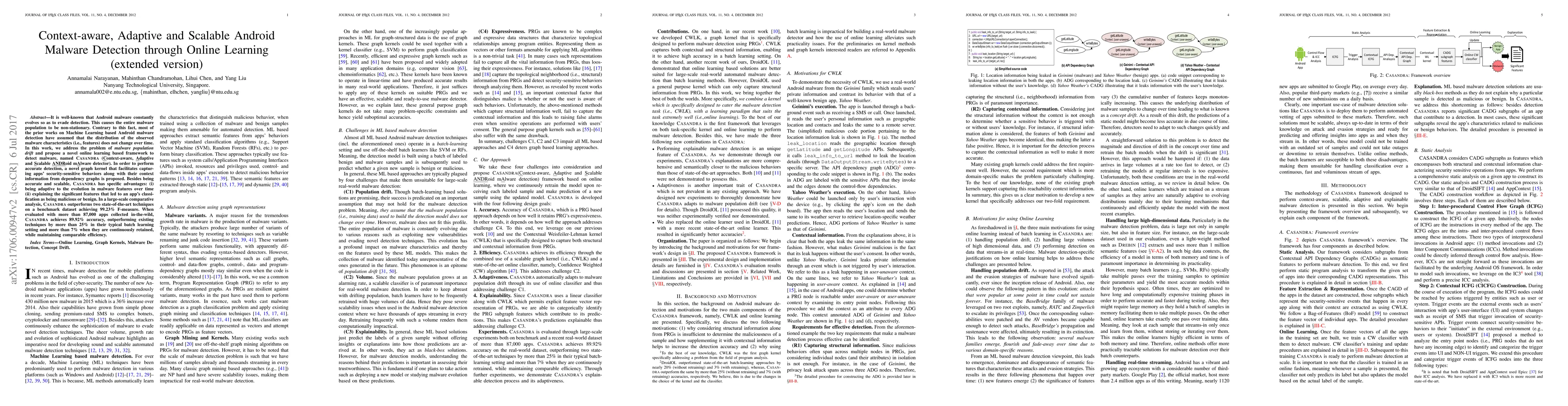 This paper proposes CASANDRA, an online learning framework for detecting evolving Android malware by addressing non-stationary malware populations. CASANDRA uses a novel graph kernel to capture apps' security-sensitive behaviors and context information, achieving 99.23% F-measure in comparative analysis and 89.92% accuracy on real-world data, outperforming existing techniques significantly.