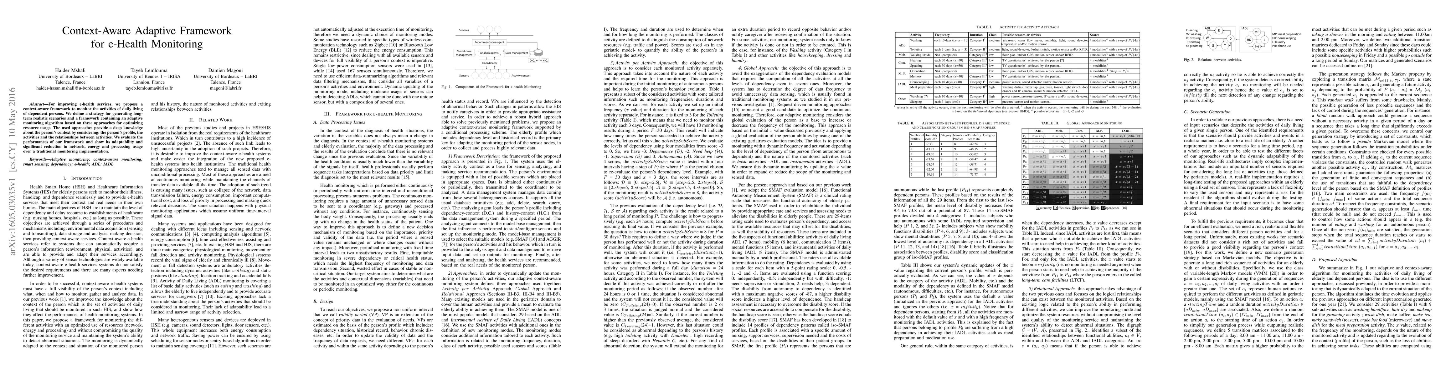 For improving e-health services, we propose a context-aware framework to monitor the activities of daily living of dependent persons. We define a strategy for generating long-term realistic scenarios and a framework containing an adaptive monitoring algorithm based on three approaches for optimizing resource usage. The used approaches provide a deep knowledge about the person's context by considering: the person's profile, the activities and the relationships between activities. We evaluate the performances of our framework and show its adaptability and significant reduction in network, energy and processing usage over a traditional monitoring implementation.