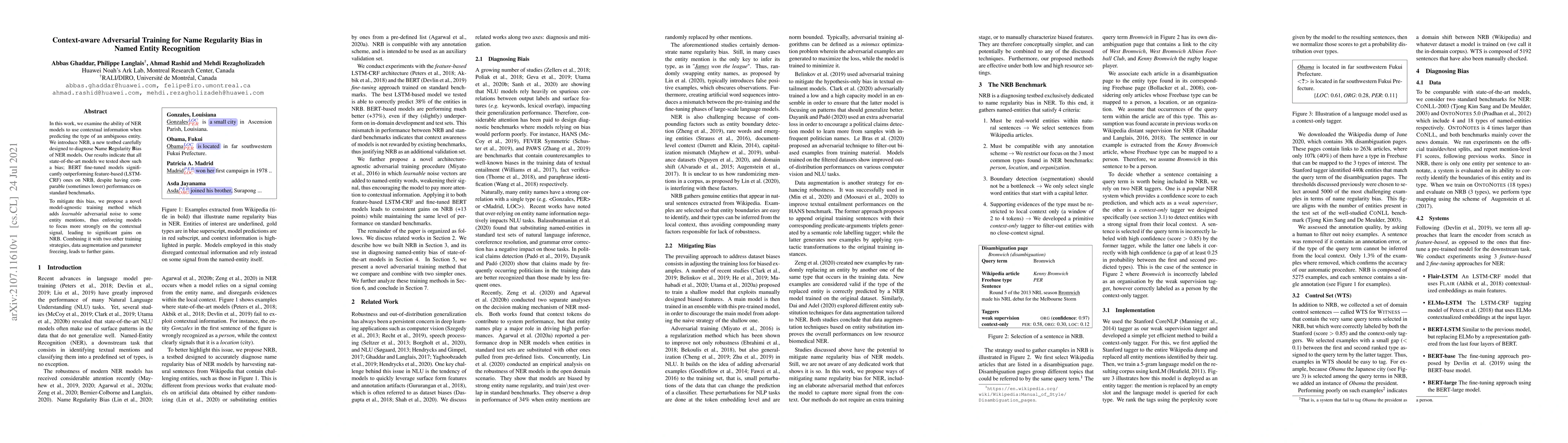 In this work, we examine the ability of NER models to use contextual information when predicting the type of an ambiguous entity. We introduce NRB, a new testbed carefully designed to diagnose Name Regularity Bias of NER models. Our results indicate that all state-of-the-art models we tested show such a bias; BERT fine-tuned models significantly outperforming feature-based (LSTM-CRF) ones on NRB, despite having comparable (sometimes lower) performance on standard benchmarks. To mitigate this bias, we propose a novel model-agnostic training method that adds learnable adversarial noise to some entity mentions, thus enforcing models to focus more strongly on the contextual signal, leading to significant gains on NRB. Combining it with two other training strategies, data augmentation and parameter freezing, leads to further gains.
