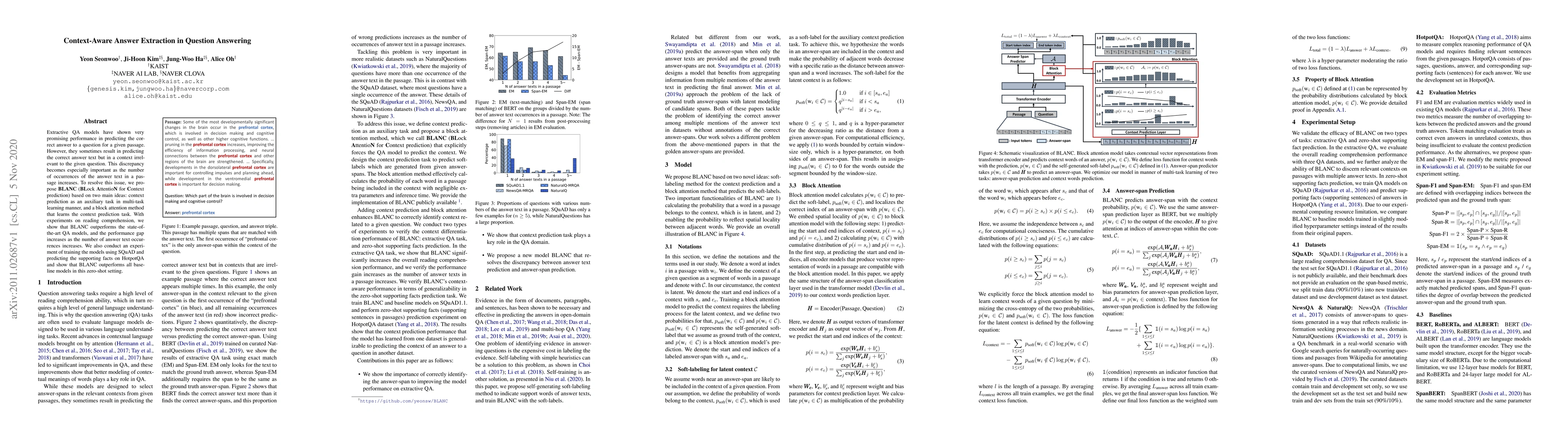 Extractive QA models have shown very promising performance in predicting the correct answer to a question for a given passage. However, they sometimes result in predicting the correct answer text but in a context irrelevant to the given question. This discrepancy becomes especially important as the number of occurrences of the answer text in a passage increases. To resolve this issue, we propose \textbf{BLANC} (\textbf{BL}ock \textbf{A}ttentio\textbf{N} for \textbf{C}ontext prediction) based on two main ideas: context prediction as an auxiliary task in multi-task learning manner, and a block attention method that learns the context prediction task. With experiments on reading comprehension, we show that BLANC outperforms the state-of-the-art QA models, and the performance gap increases as the number of answer text occurrences increases. We also conduct an experiment of training the models using SQuAD and predicting the supporting facts on HotpotQA and show that BLANC outperforms all baseline models in this zero-shot setting.