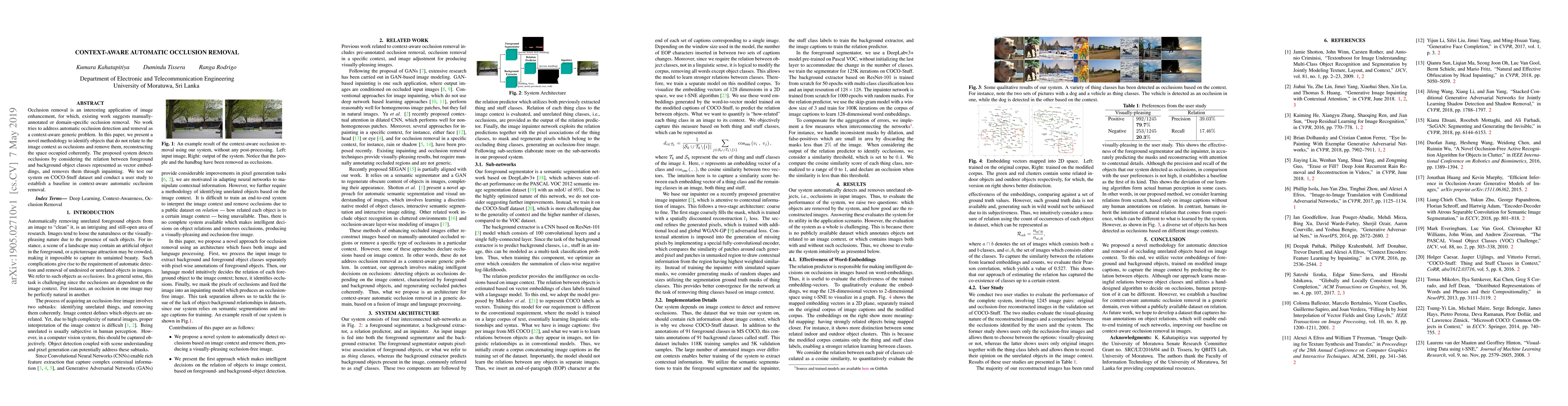 This work is novel as it approaches occlusion removal as a context-aware generic problem, unlike existing methods that focus on manually-annotated or domain-specific occlusion removal.