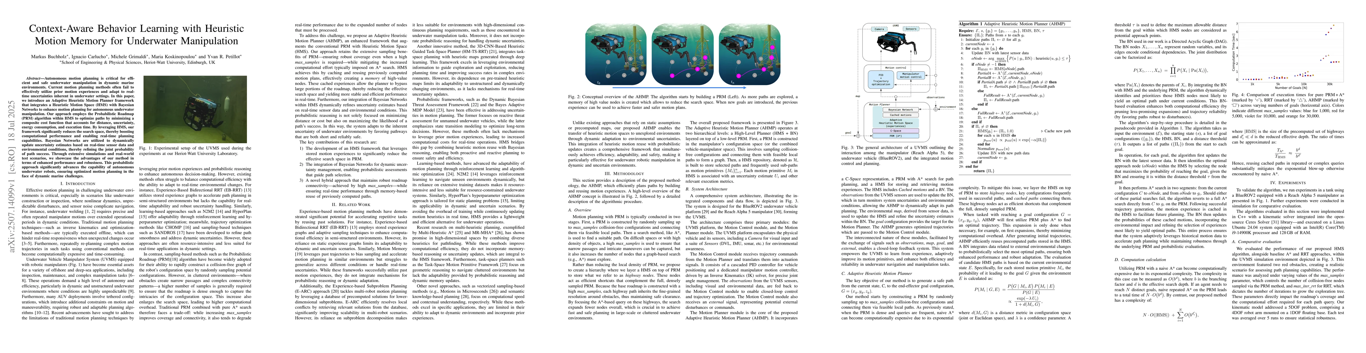 Autonomous motion planning is critical for efficient and safe underwater manipulation in dynamic marine environments. Current motion planning methods often fail to effectively utilize prior motion experiences and adapt to real-time uncertainties inherent in underwater settings. In this paper, we introduce an Adaptive Heuristic Motion Planner framework that integrates a Heuristic Motion Space (HMS) with Bayesian Networks to enhance motion planning for autonomous underwater manipulation. Our approach employs the Probabilistic Roadmap (PRM) algorithm within HMS to optimize paths by minimizing a composite cost function that accounts for distance, uncertainty, energy consumption, and execution time. By leveraging HMS, our framework significantly reduces the search space, thereby boosting computational performance and enabling real-time planning capabilities. Bayesian Networks are utilized to dynamically update uncertainty estimates based on real-time sensor data and environmental conditions, thereby refining the joint probability of path success. Through extensive simulations and real-world test scenarios, we showcase the advantages of our method in terms of enhanced performance and robustness. This probabilistic approach significantly advances the capability of autonomous underwater robots, ensuring optimized motion planning in the face of dynamic marine challenges.