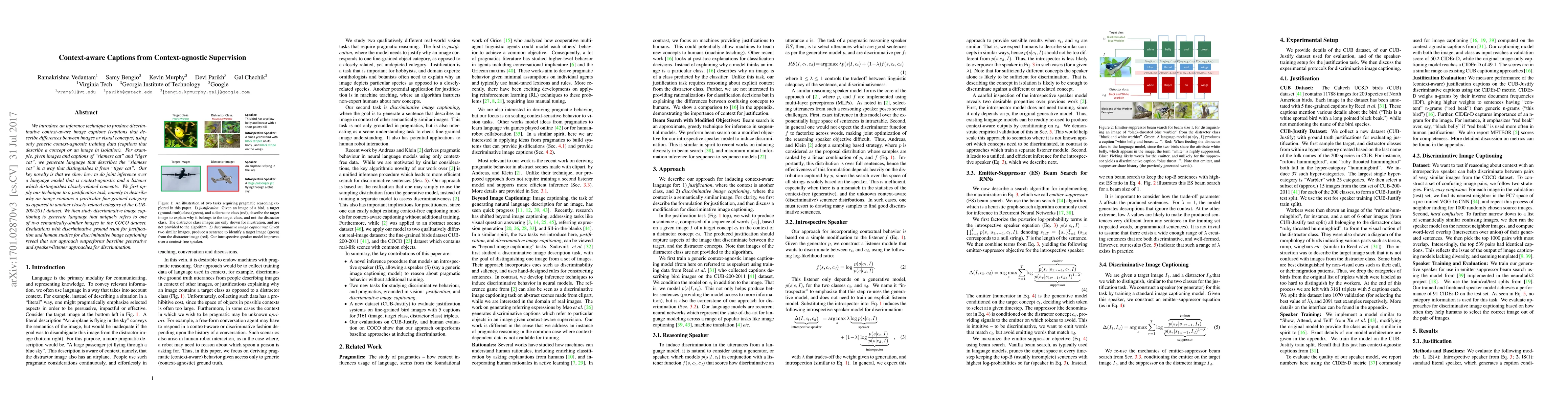 We introduce an inference technique to produce discriminative context-aware image captions (captions that describe differences between images or visual concepts) using only generic context-agnostic training data (captions that describe a concept or an image in isolation). For example, given images and captions of "siamese cat" and "tiger cat", we generate language that describes the "siamese cat" in a way that distinguishes it from "tiger cat". Our key novelty is that we show how to do joint inference over a language model that is context-agnostic and a listener which distinguishes closely-related concepts. We first apply our technique to a justification task, namely to describe why an image contains a particular fine-grained category as opposed to another closely-related category of the CUB-200-2011 dataset. We then study discriminative image captioning to generate language that uniquely refers to one of two semantically-similar images in the COCO dataset. Evaluations with discriminative ground truth for justification and human studies for discriminative image captioning reveal that our approach outperforms baseline generative and speaker-listener approaches for discrimination.