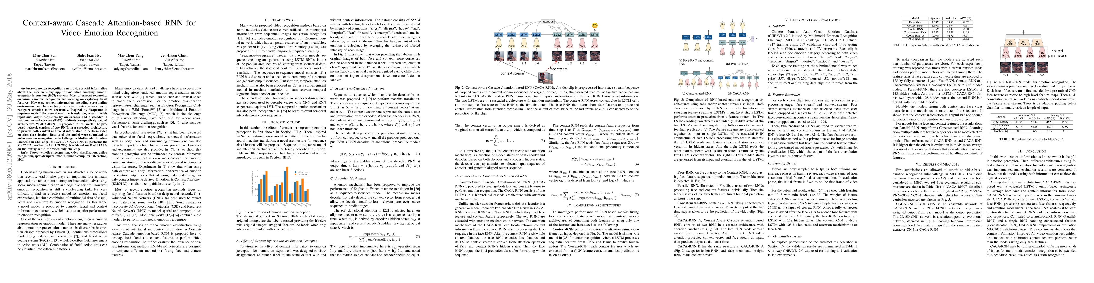 This paper proposes a novel "CACA-RNN" architecture using cascaded attention-based RNNs to process both facial and contextual information for video emotion recognition, outperforming the MEC2017 baseline with a mAP of 45.51%. The model integrates context-aware features to enhance emotion classification accuracy.