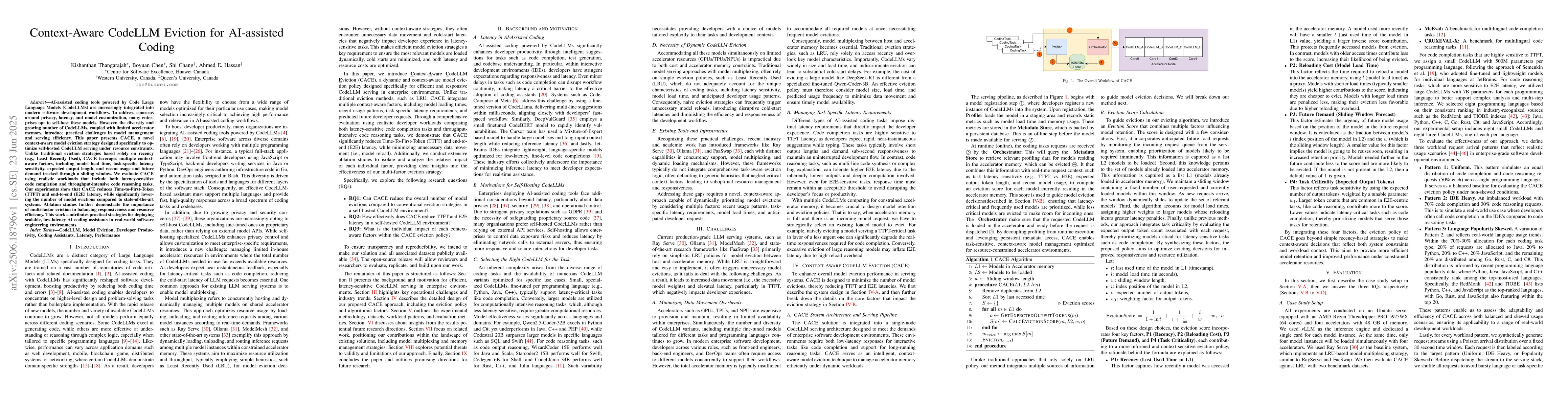 AI-assisted coding tools powered by Code Large Language Models (CodeLLMs) are increasingly integrated into modern software development workflows. To address concerns around privacy, latency, and model customization, many enterprises opt to self-host these models. However, the diversity and growing number of CodeLLMs, coupled with limited accelerator memory, introduce practical challenges in model management and serving efficiency. This paper presents CACE, a novel context-aware model eviction strategy designed specifically to optimize self-hosted CodeLLM serving under resource constraints. Unlike traditional eviction strategies based solely on recency (e.g., Least Recently Used), CACE leverages multiple context-aware factors, including model load time, task-specific latency sensitivity, expected output length, and recent usage and future demand tracked through a sliding window. We evaluate CACE using realistic workloads that include both latency-sensitive code completion and throughput-intensive code reasoning tasks. Our experiments show that CACE reduces Time-to-First-Token (TTFT) and end-to-end (E2E) latency, while significantly lowering the number of model evictions compared to state-of-the-art systems. Ablation studies further demonstrate the importance of multi-factor eviction in balancing responsiveness and resource efficiency. This work contributes practical strategies for deploying scalable, low-latency AI coding assistants in real-world software engineering environments.