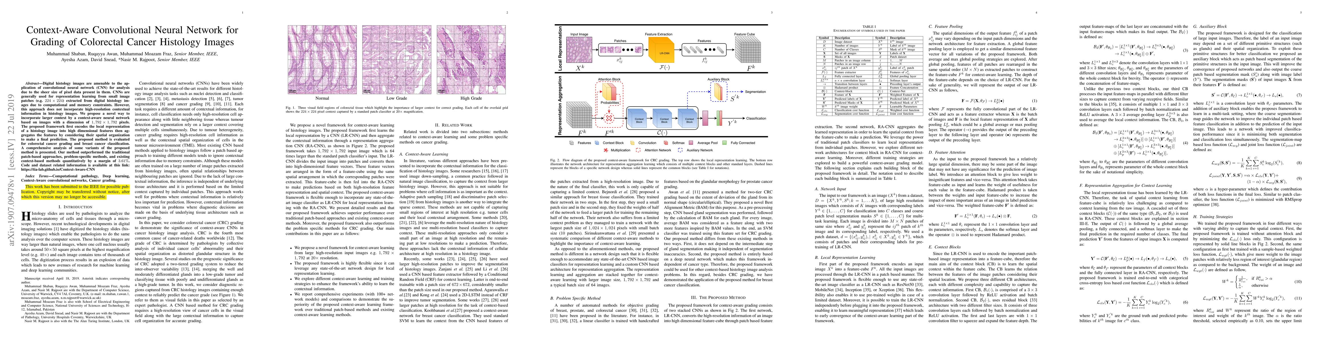 This paper proposes a context-aware convolutional neural network for grading colorectal cancer histology images, utilizing large images to incorporate high-resolution contextual information. The method outperforms traditional patch-based approaches by 3.61% in accuracy.
