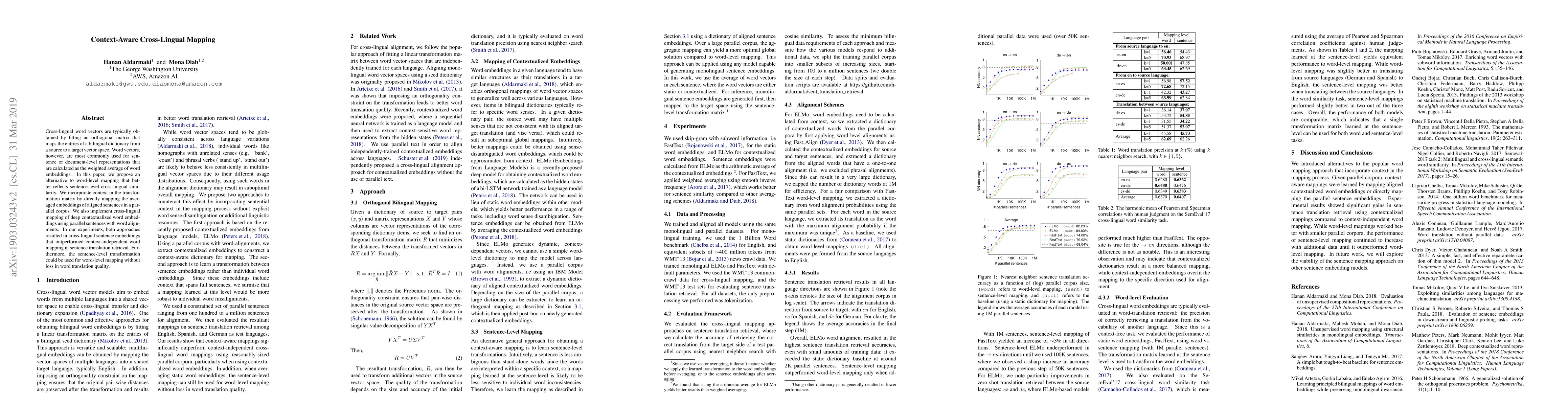 This paper proposes context-aware methods for cross-lingual mapping that map averaged sentence embeddings rather than word-level embeddings, achieving better sentence-level cross-lingual similarity. Experiments show improved performance in sentence translation retrieval compared to traditional word-level mapping.