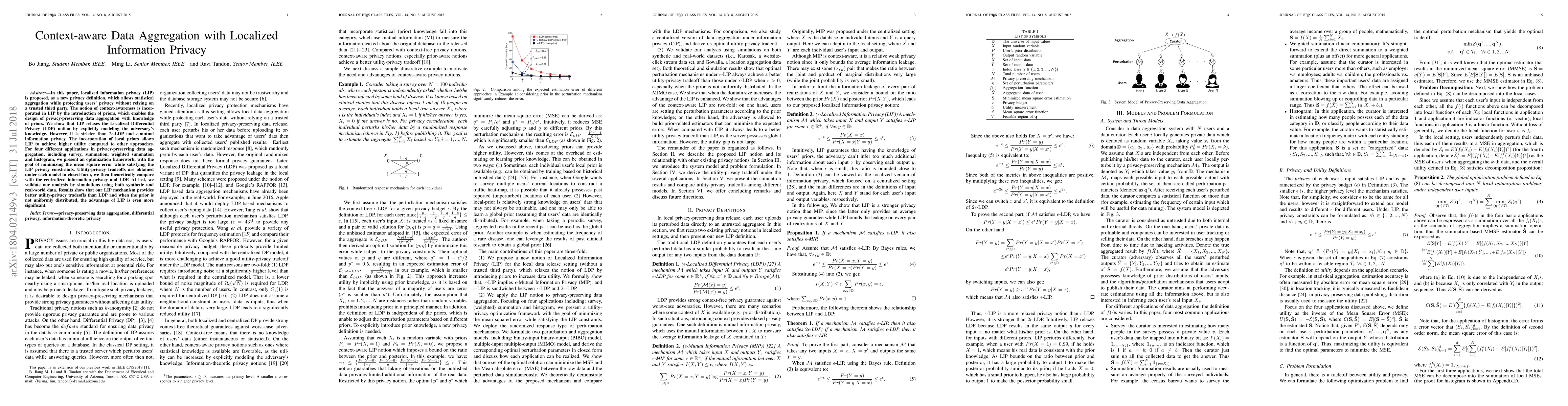 This paper introduces Localized Information Privacy (LIP), a novel privacy definition that enables statistical data aggregation while safeguarding user privacy without a trusted third party. LIP incorporates context-awareness through priors, allowing for higher utility compared to other privacy models like Localized Differential Privacy (LDP). The authors present an optimization framework to minimize error while adhering to LIP constraints, demonstrating superior utility-privacy tradeoffs through numerical analysis on both synthetic and real-world data.